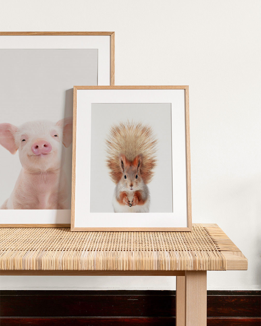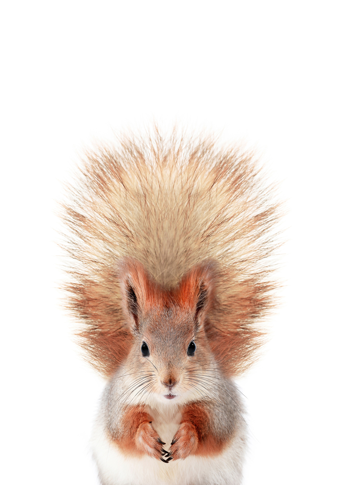Denna ljuvliga porträtt av Kathrin Pienaar visar en söt ekorre med sin fluffiga svans, perfekt för barnrummet. En underbar och kärleksfull detalj som inspirerar till naturkärlek.