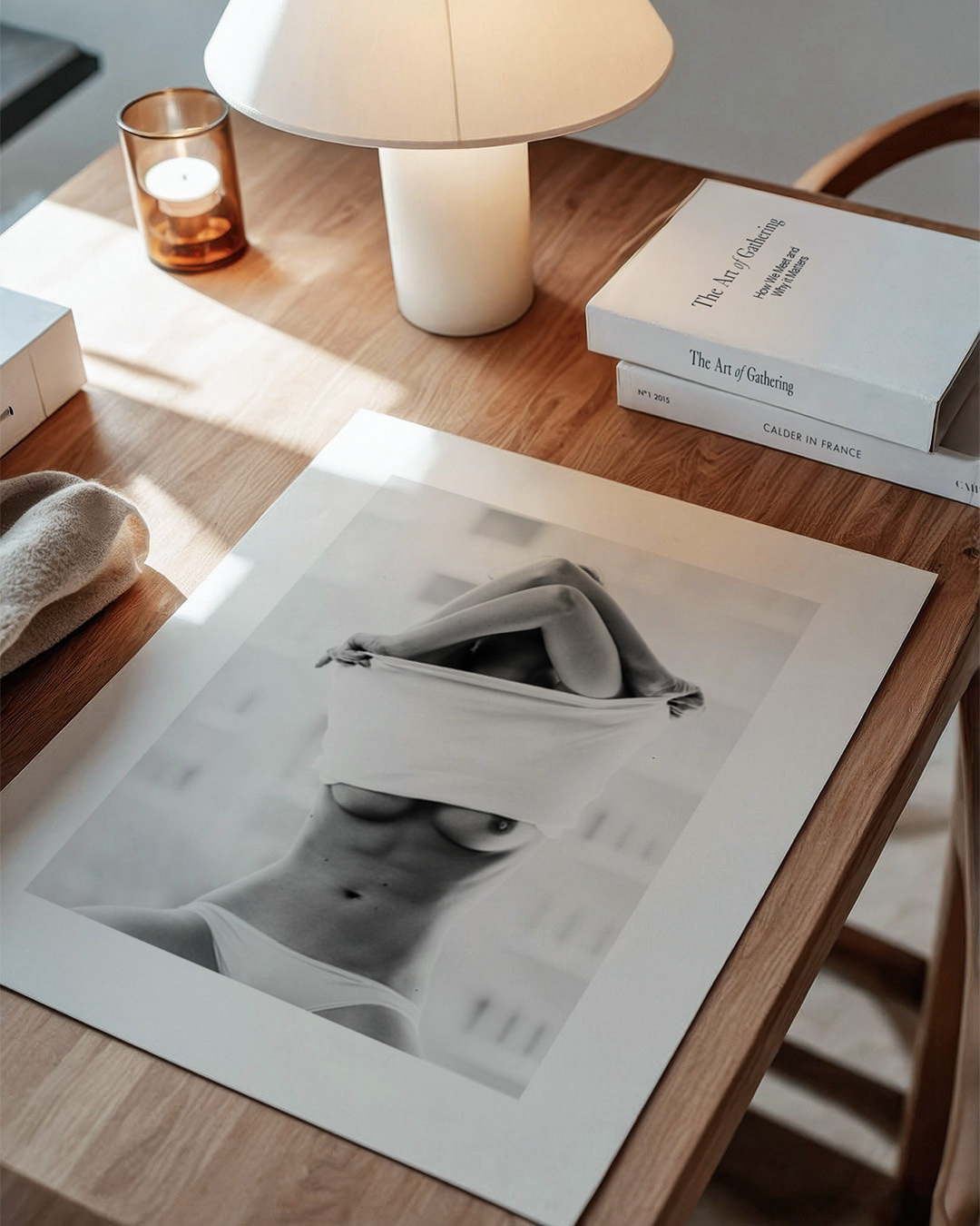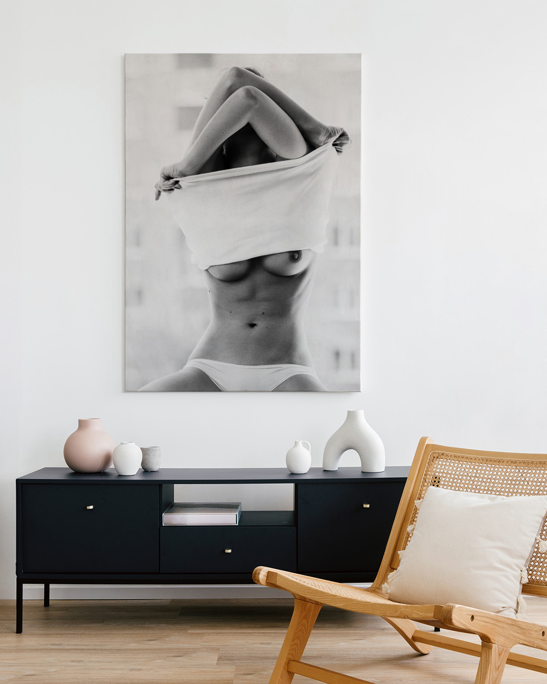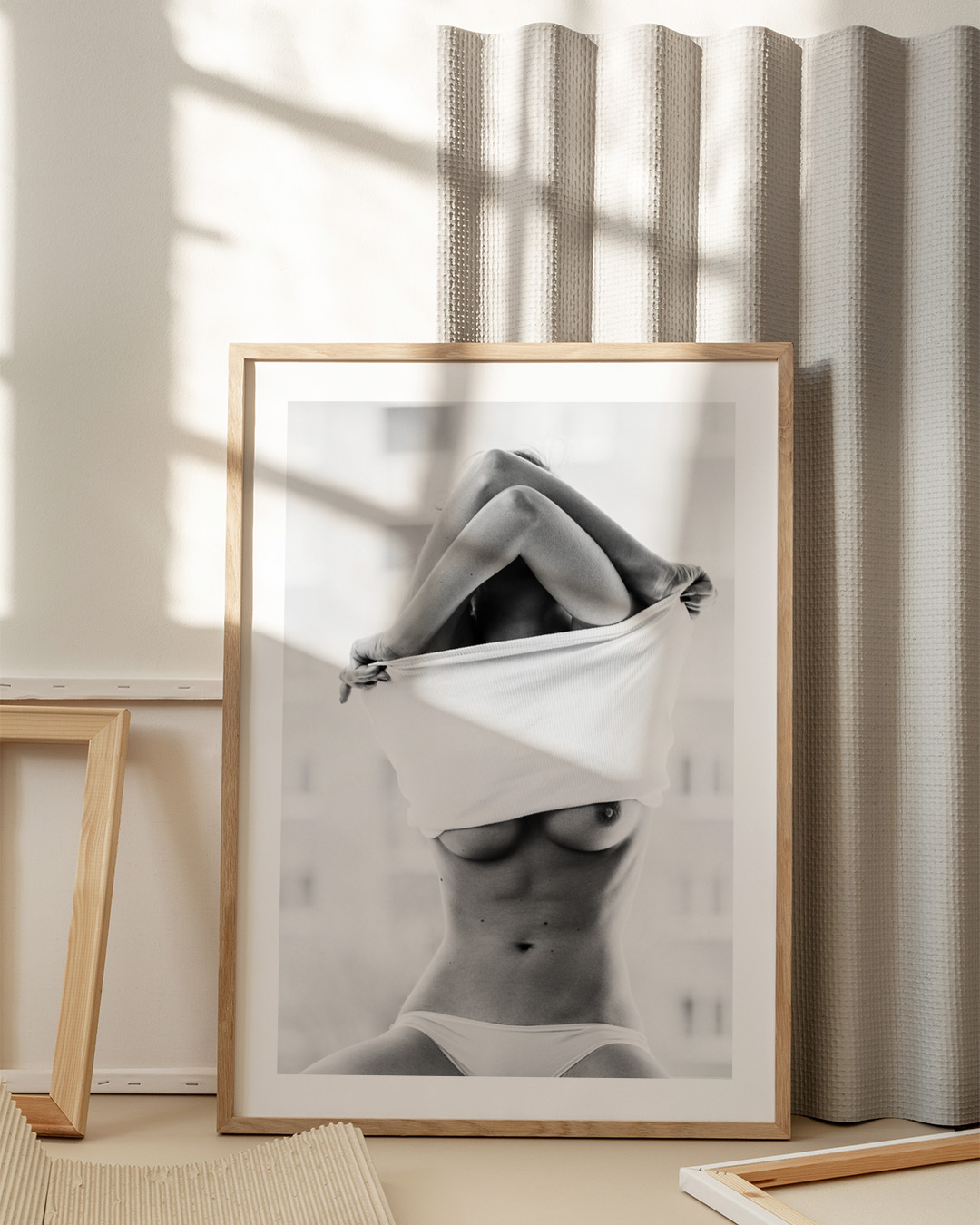 Martin Krystynek fångar essensen av sensualitet i ett slående svartvitt fotografi, smakfullt avslöjande och omfamnar naturlig skönhet och mystik. Denna bit utstrålar elegans och självförtroende och visar konstnärens mästerskap i porträttfotografering.