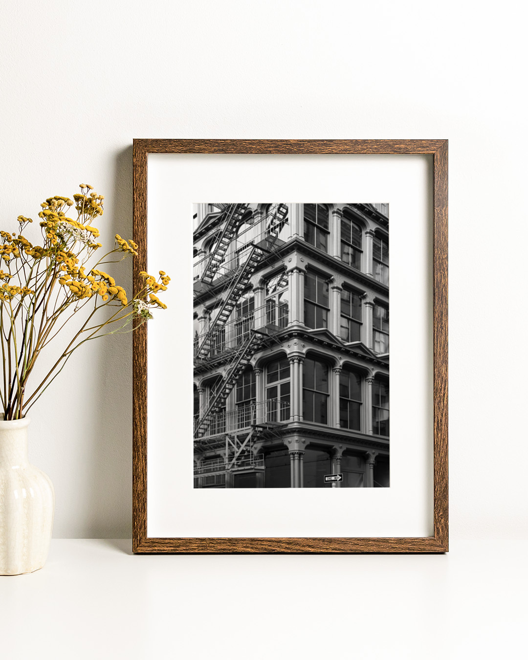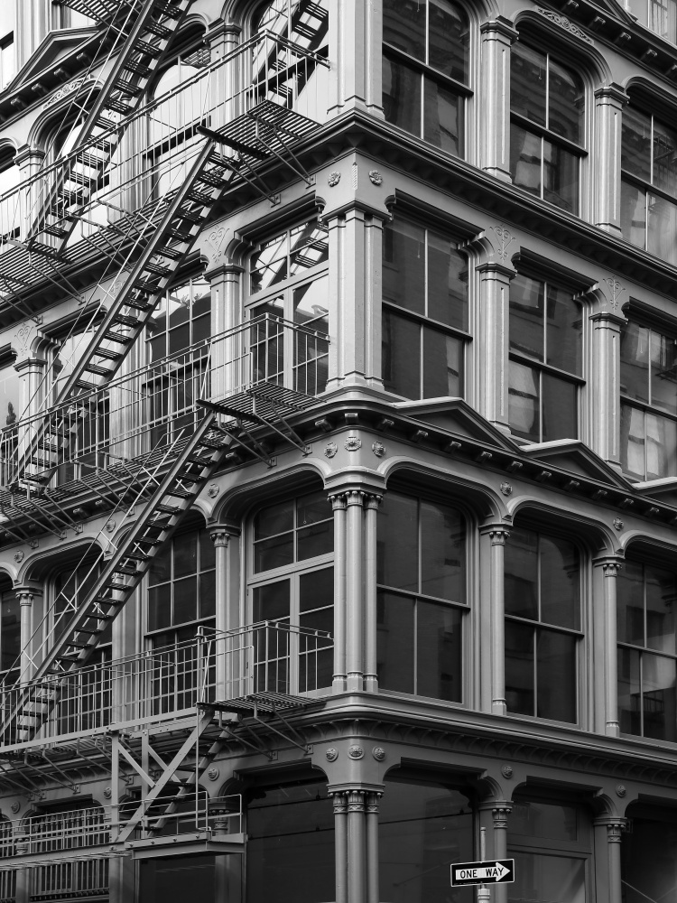 Upptäck de intrikata detaljerna i urban arkitektur i detta svartvita fotografi som visar sammankopplade brandtrappor och höga glasfönster, vilket skapar ett fängslande stadsmiljö.