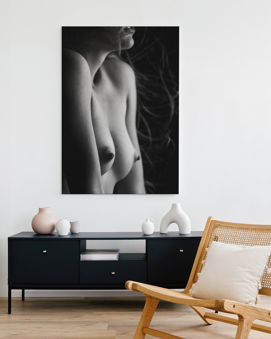 Ett fängslande svartvitt fotografi av Martin Krystynek, som visar den sensuella formen av en kvinnas kropp i delikat ljus och skuggor.