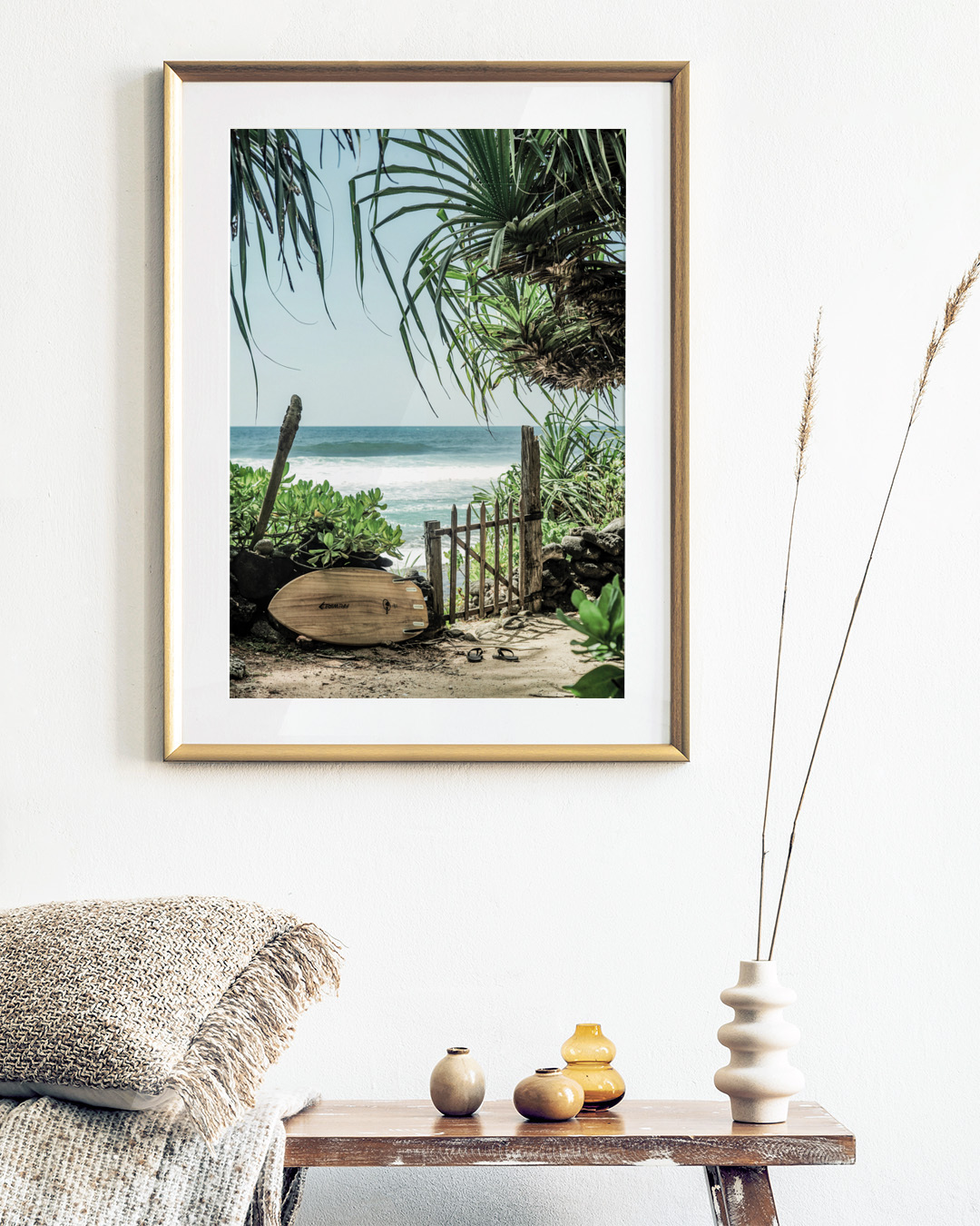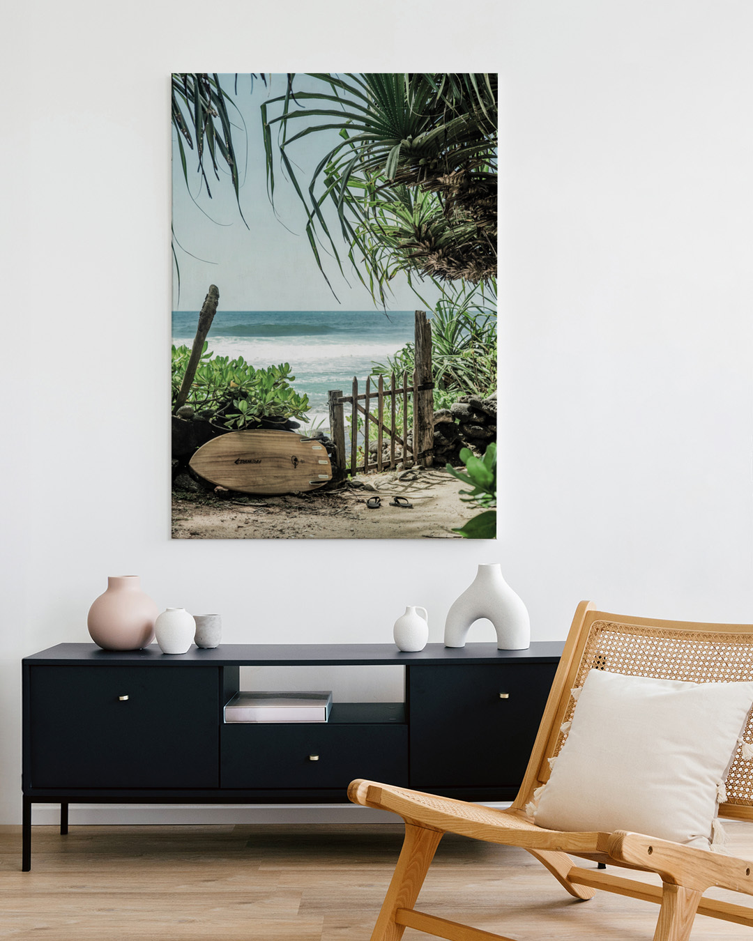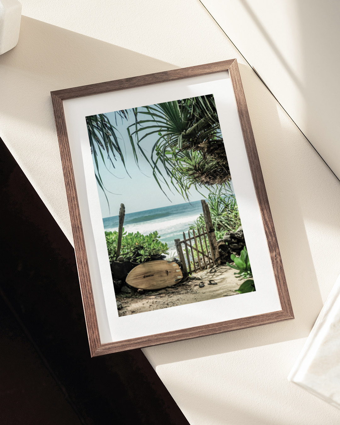 Upptäck en fridfull kustresa med en lugn tropisk strand inramad av frodig grönska. En surfbräda lutar mot det rustika staketet och inbjuder till en dag av äventyr på vågorna.