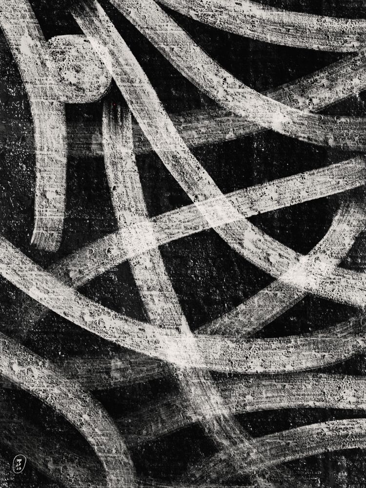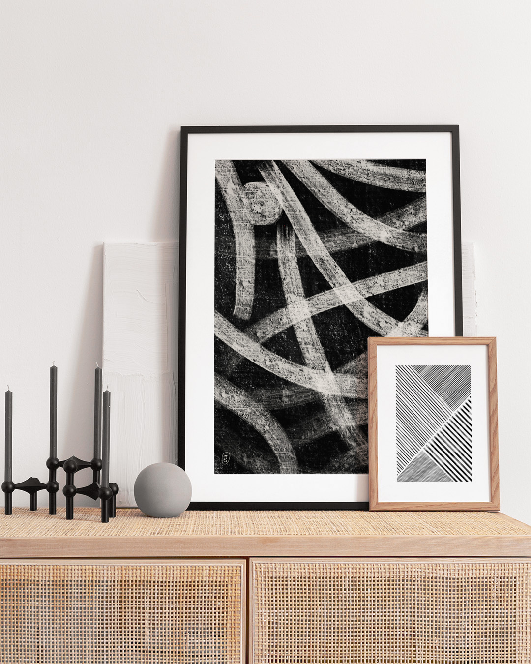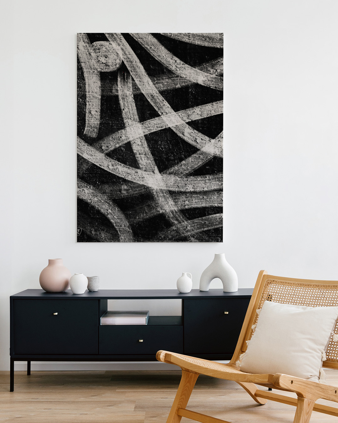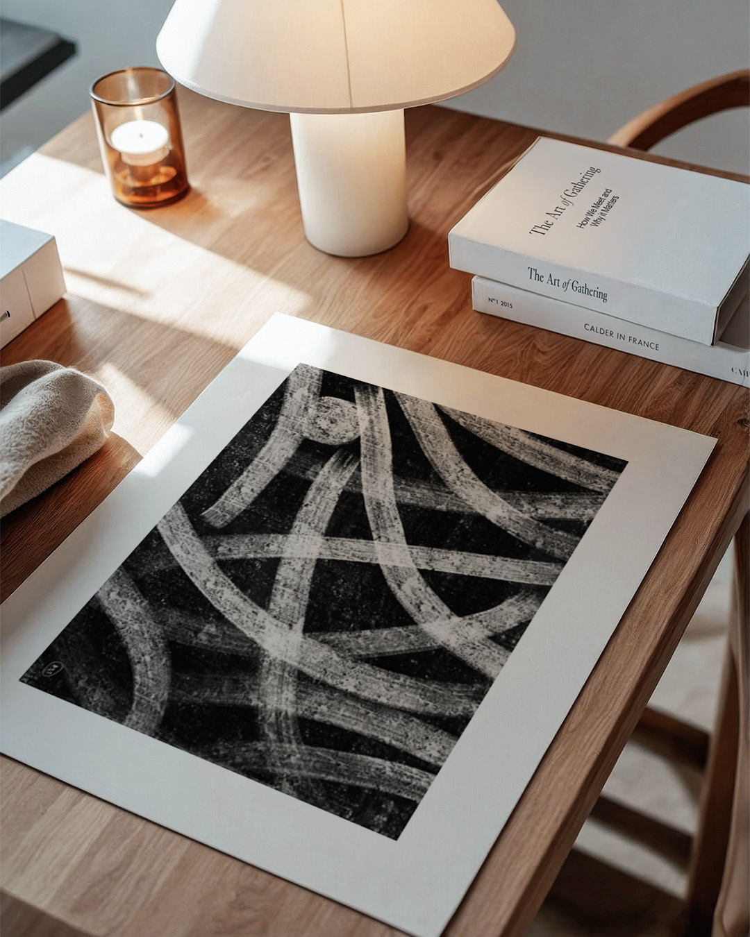 Utforska skönheten i abstrakta svarta och vita linjer som flätas ihop för att skapa fängslande geometriska rörelser över duken. Ett slående verk som inbjuder till reflektion och fantasi.