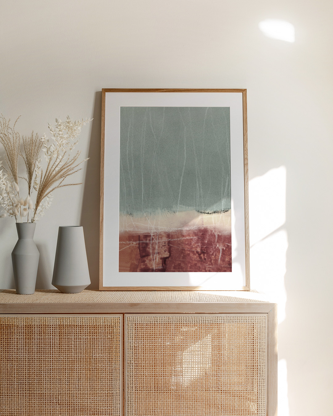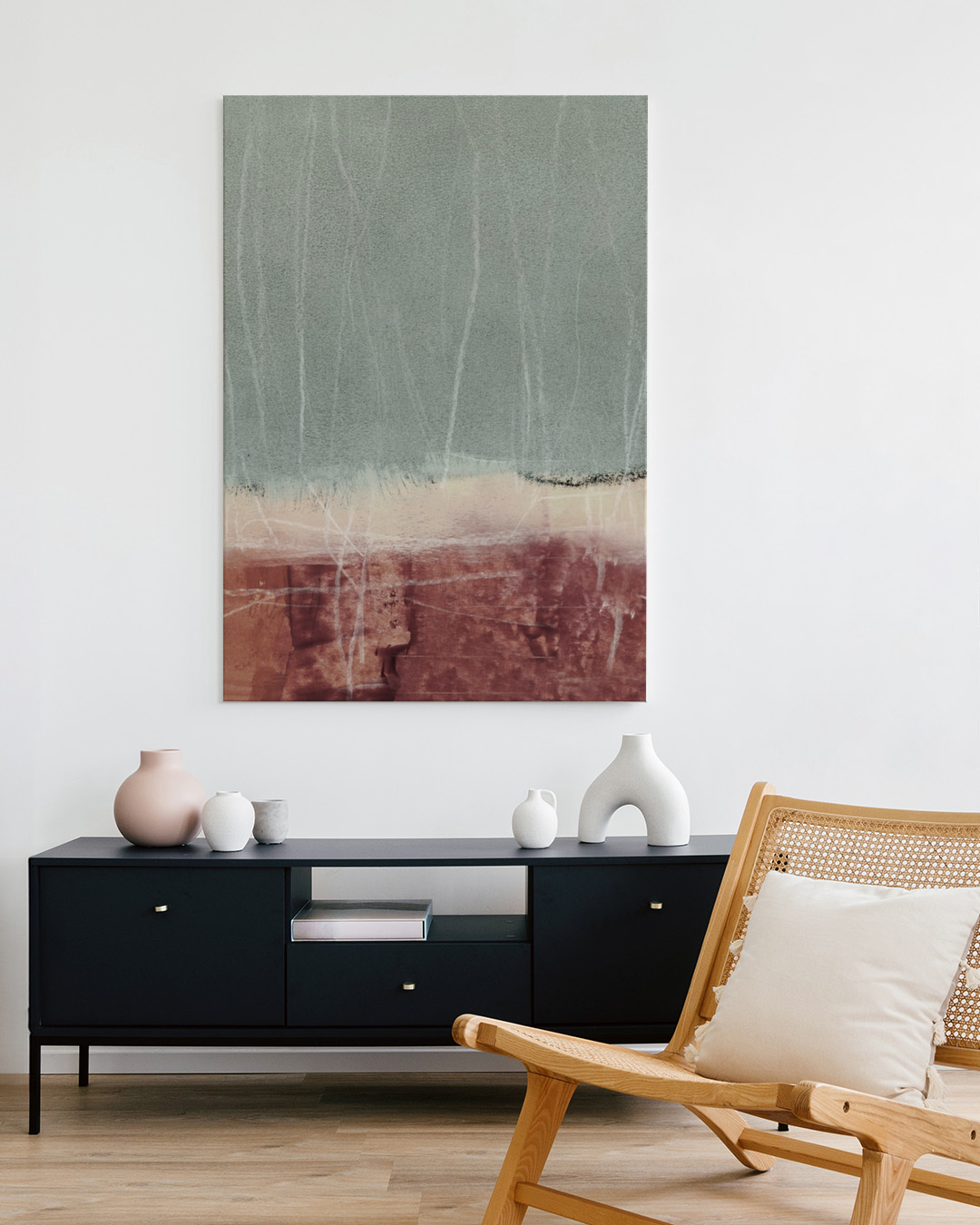 Den uppspända canvasen är inramad med en elegant skuggram i äkta trä för ett stilrent utseende och extra dimension. Utrymmet mellan canvasen och ramen skapar en svävande effekt.