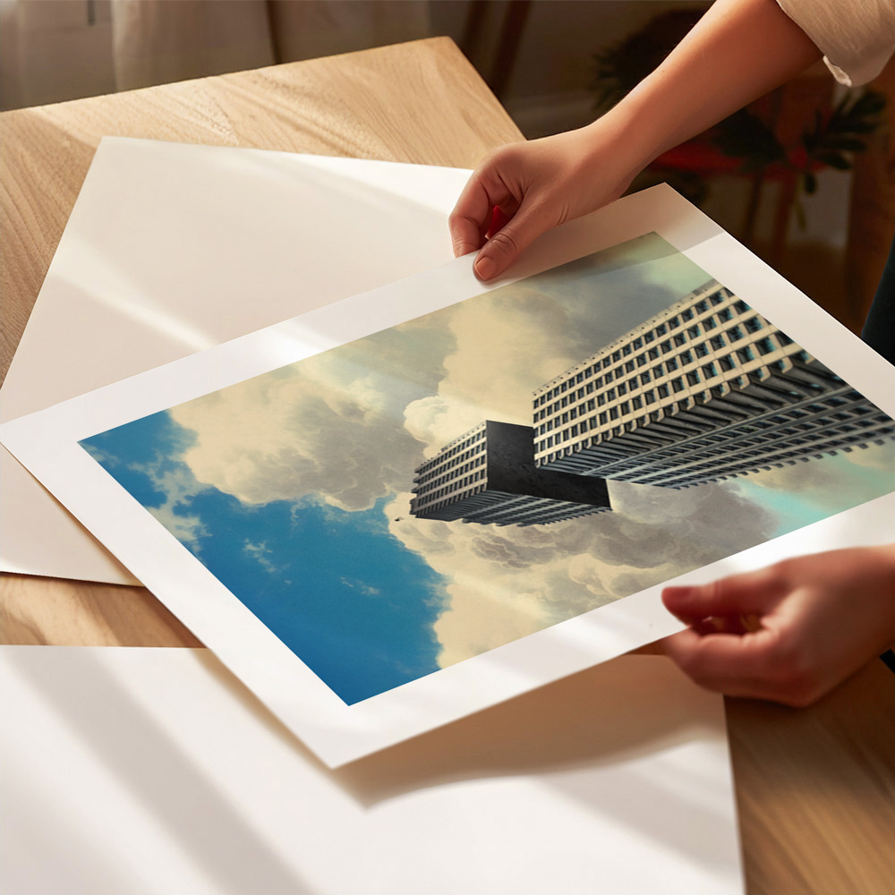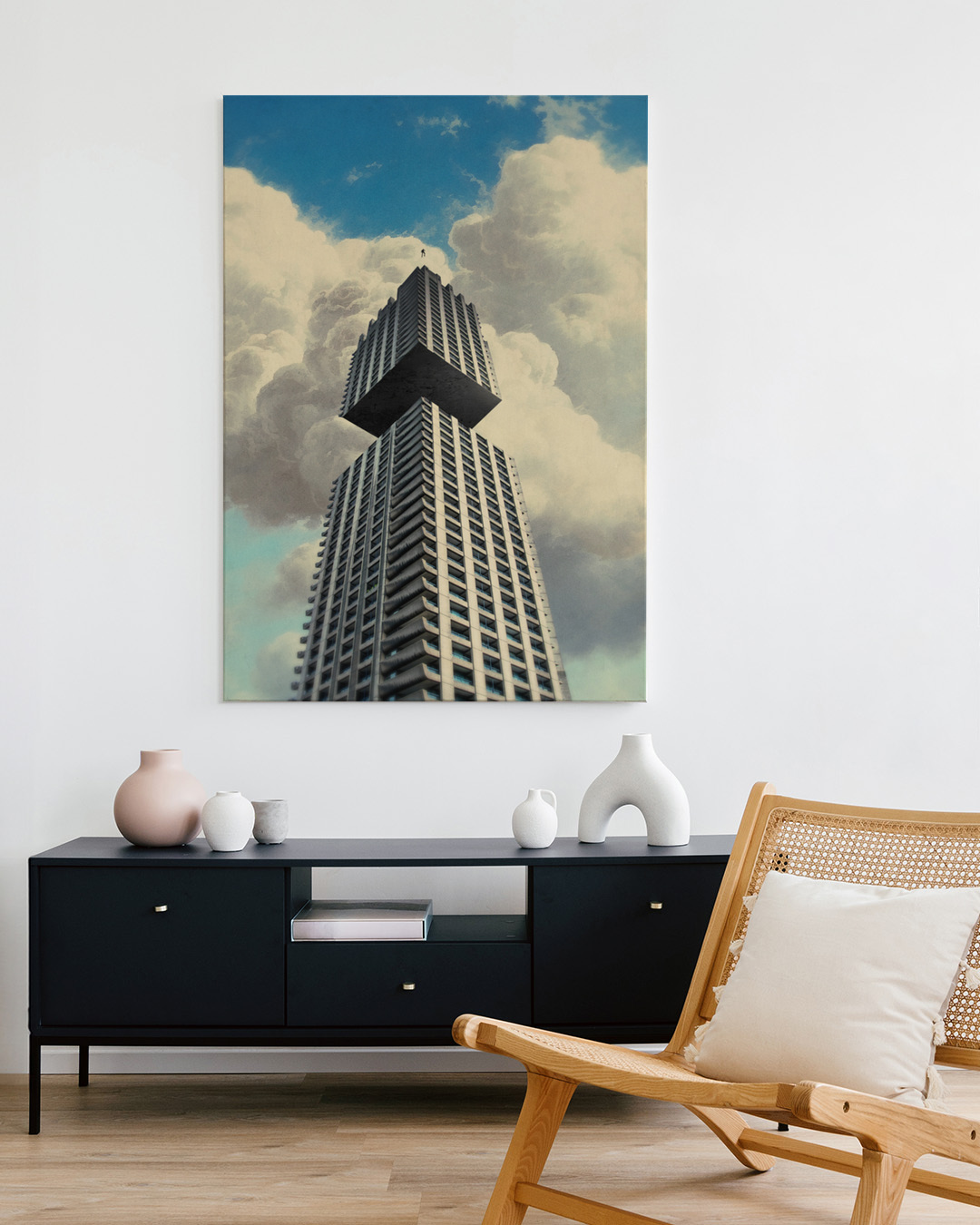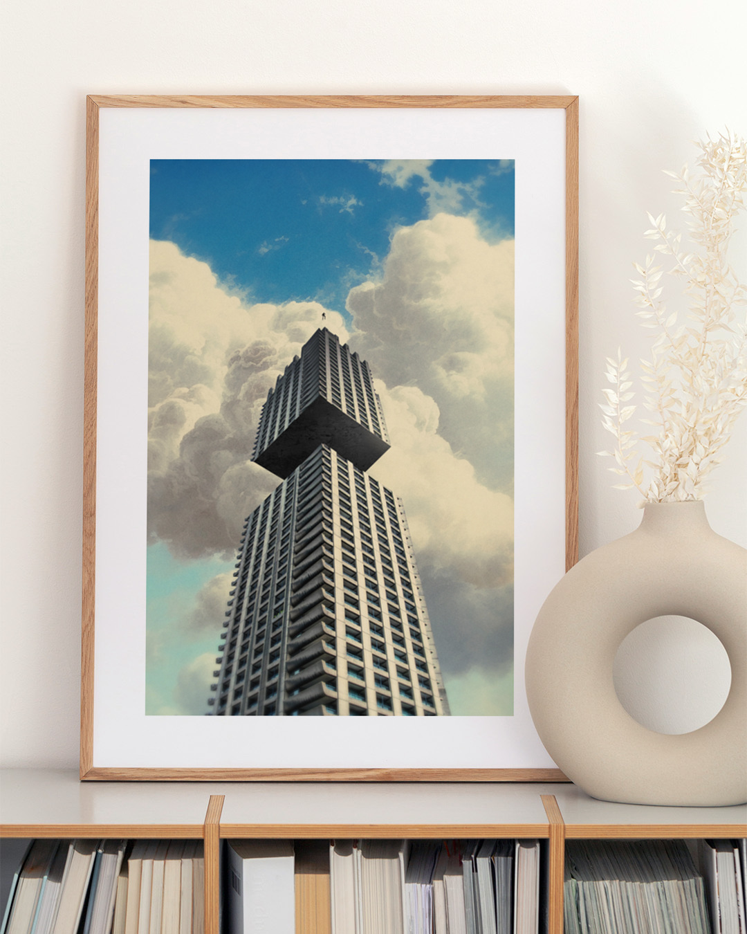 Fran Rodríguezs surrealistiska arkitekturverk visar en hög brutalistisk struktur som sträcker sig mot himlen, kontrasterad mot dramatiska moln. Denna slående komposition väcker eftertanke om modern urbanism och ambition.