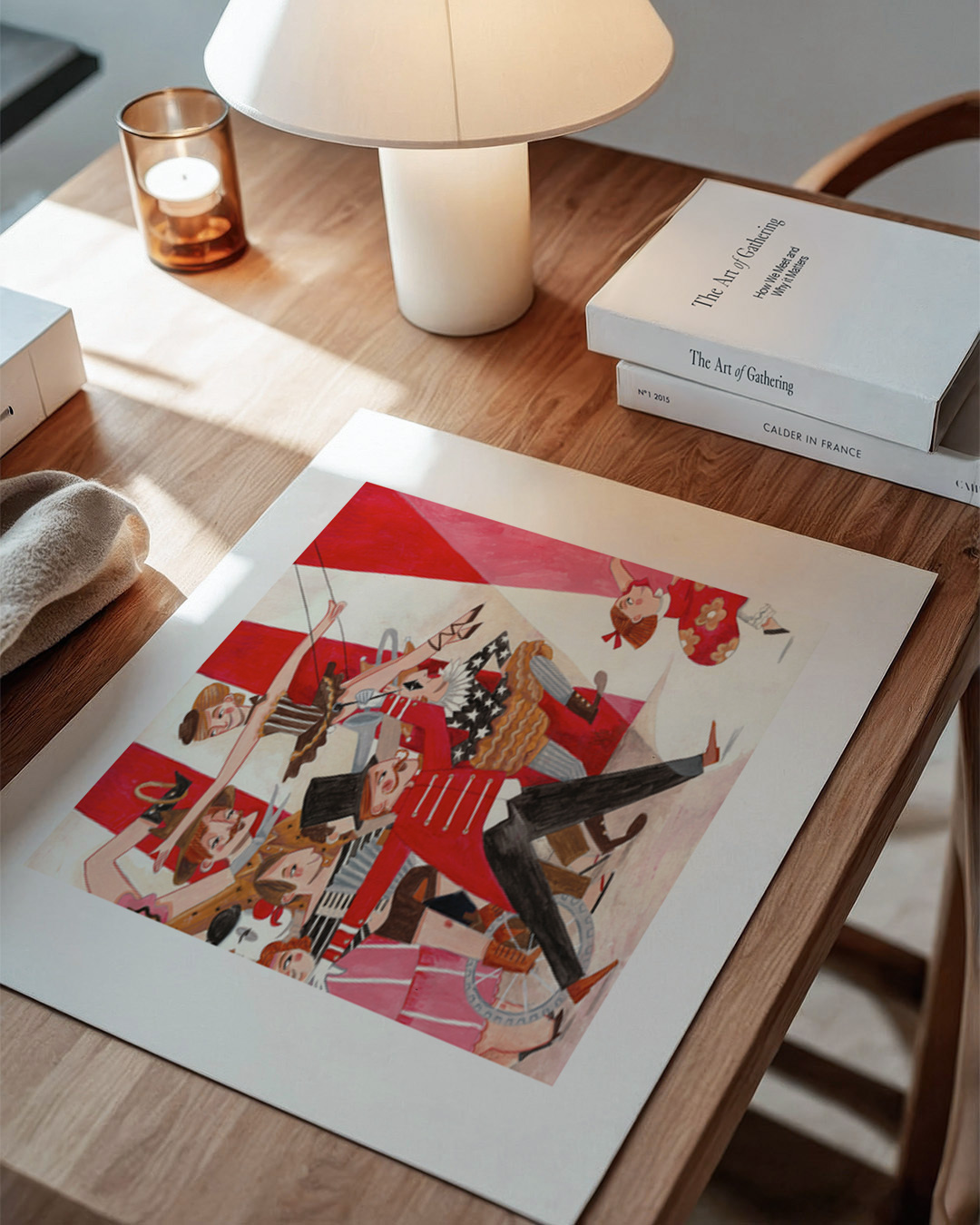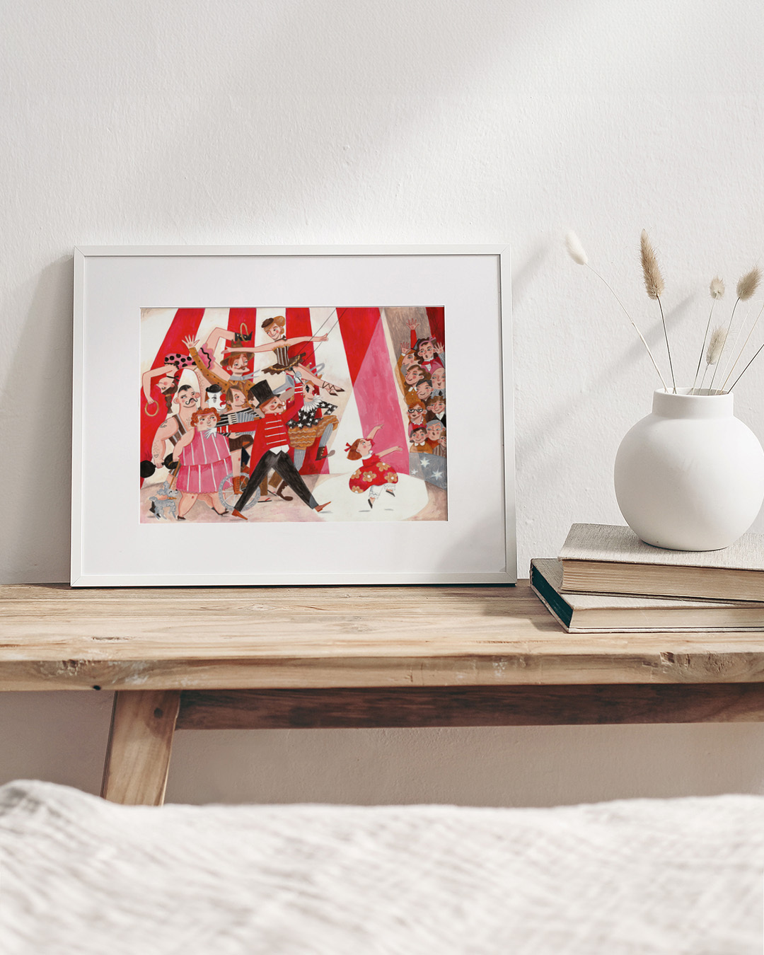 Caroline Bonne Müllers konstverk fångar en livlig cirkusscen. Entusiastiska artister och en livfull bakgrund skapar en lekfull atmosfär.