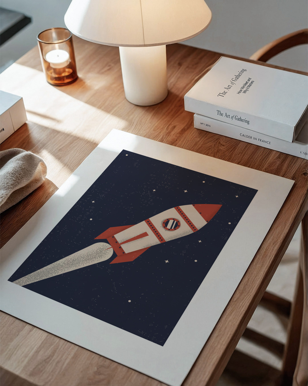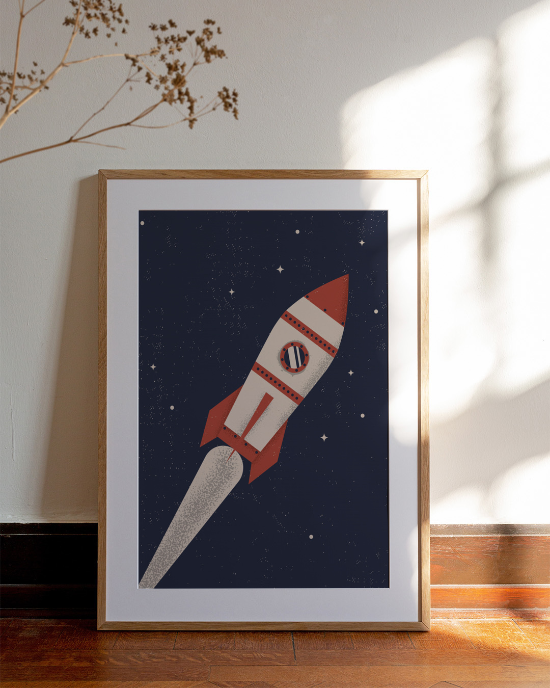 Ge dig ut på en resa över galaxen med denna lekfulla avbildning av ett raketskepp mot en stjärnspäckad natthimmel. Perfekt för rymd- och äventyrsentusiaster.