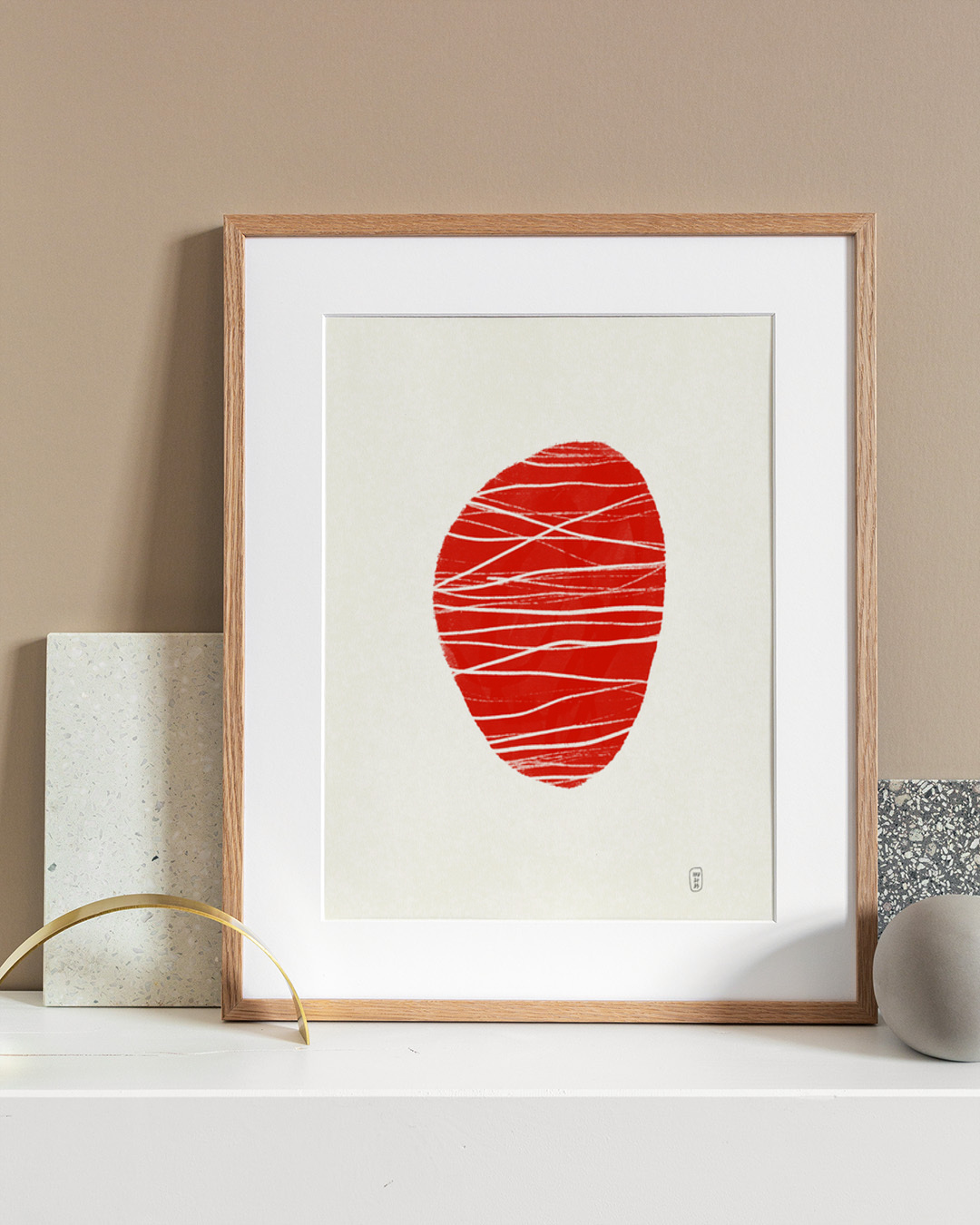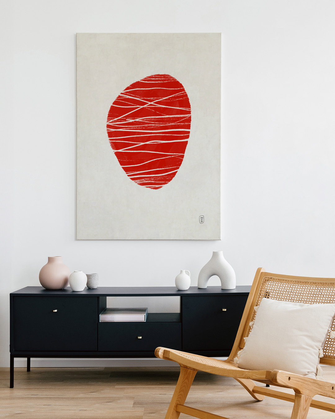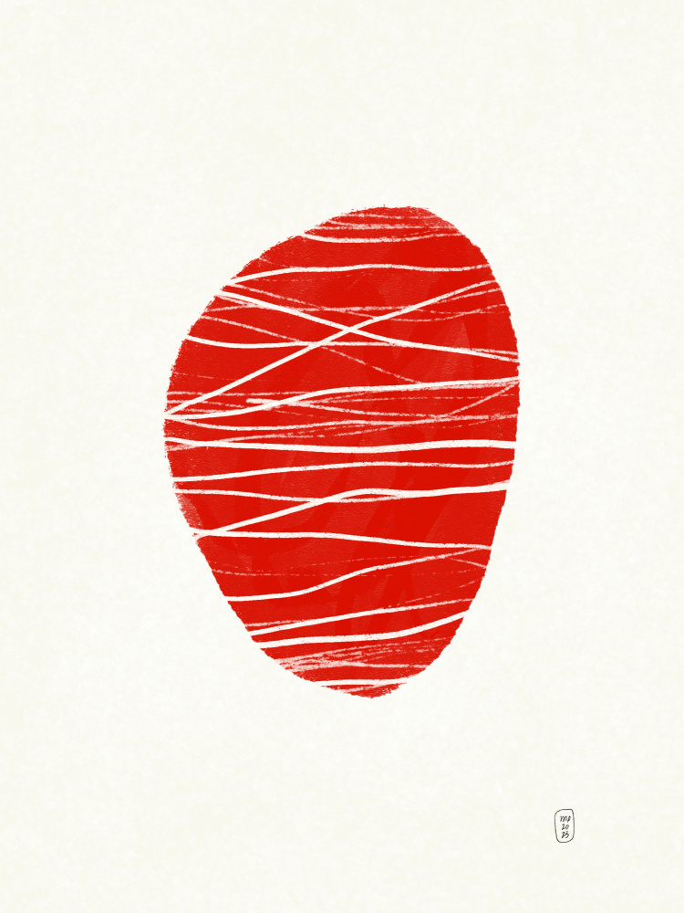 Denna abstrakta konsttryck visar en slående röd organisk form med vita linjer, vilket ger en känsla av dynamisk rörelse och modernitet. Perfekt för att ge en samtida touch till vilket utrymme som helst.