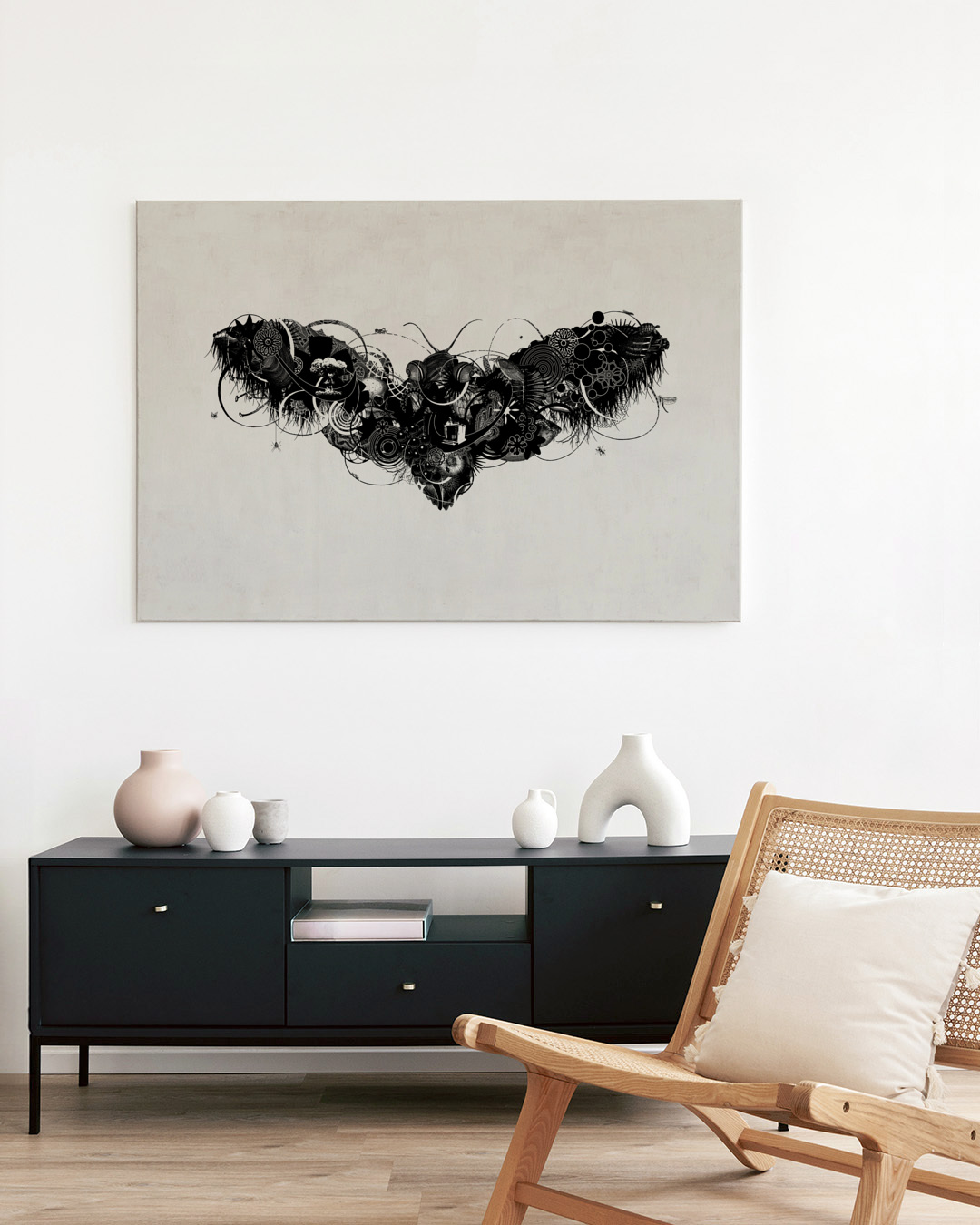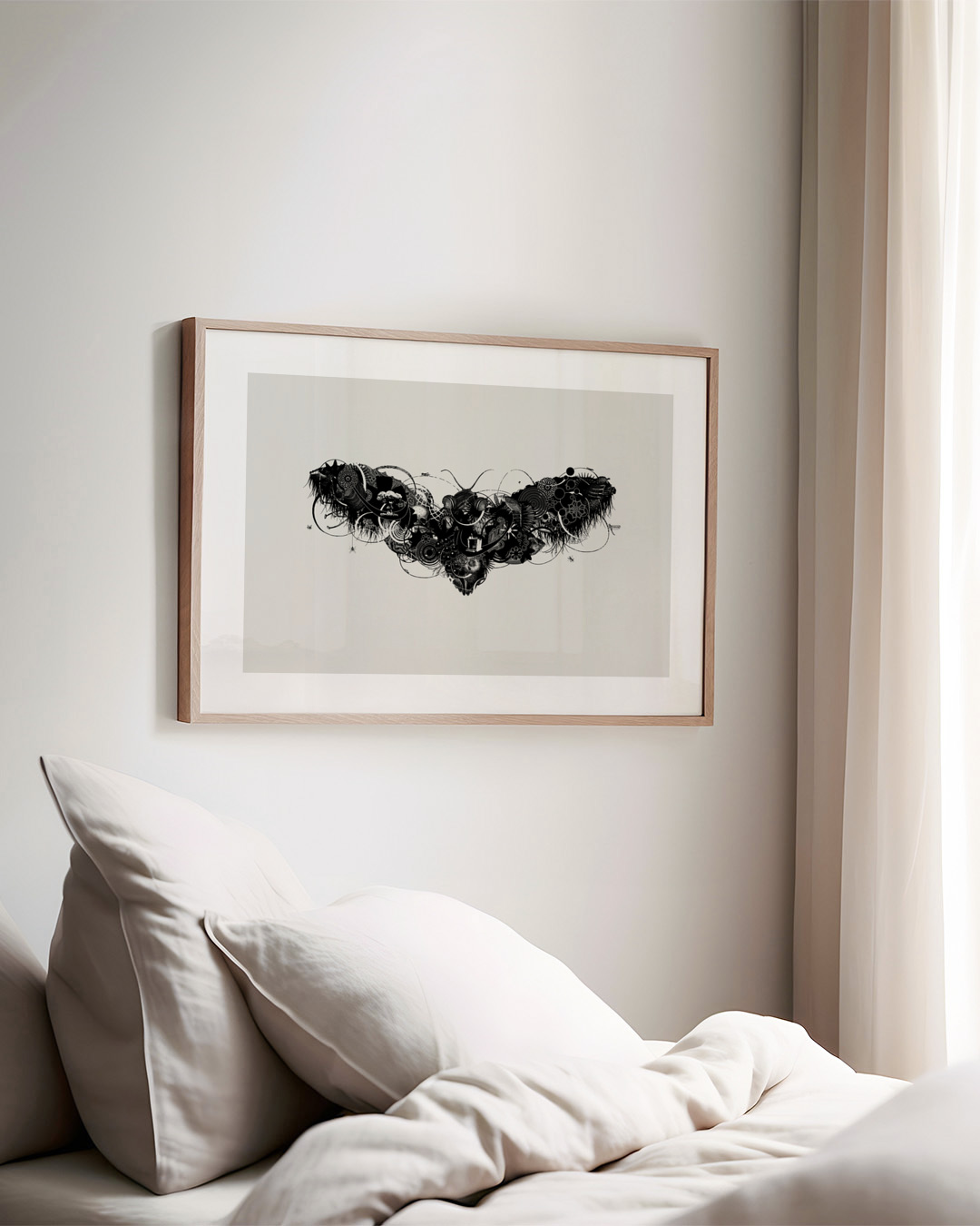 Jaco Putkers verk visar en fantasifull avbildning av en mal som består av botaniska och animaliska komponenter. Denna svartvita komposition kombinerar fantasi med natur, fångar en intrikat balans mellan fantasi och realism.