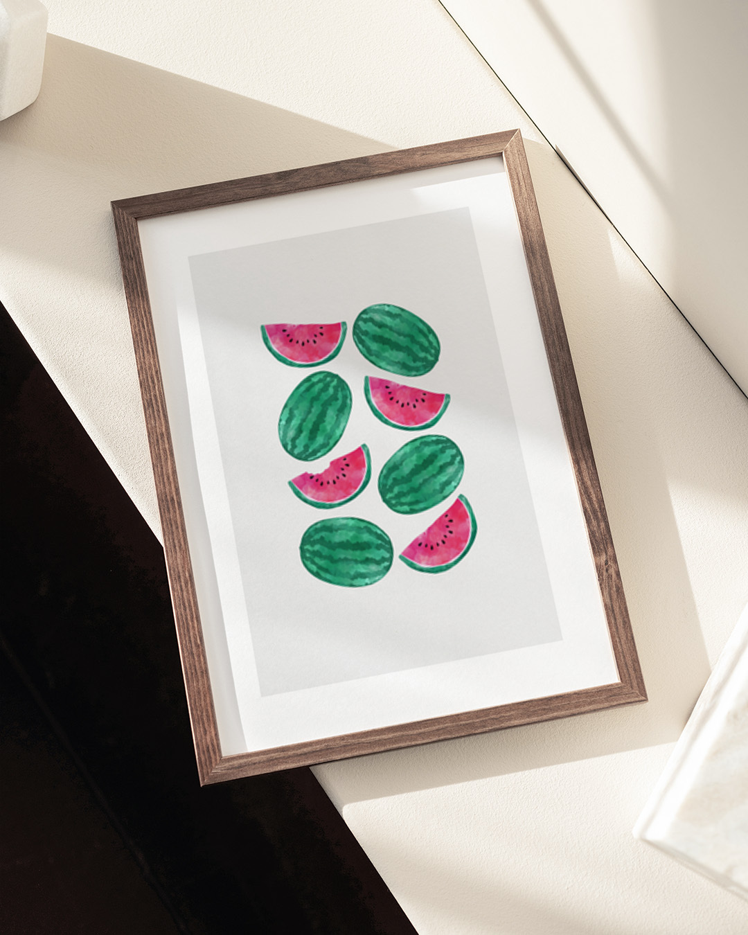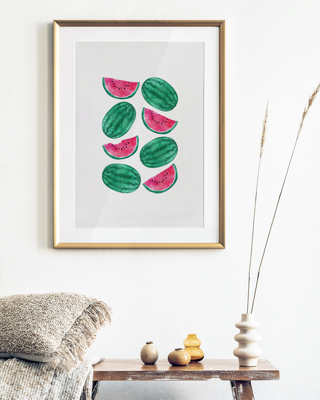 Ett levande konstverk med saftiga vattenmelonskivor och hela meloner. Subtilt men fängslande, perfekt för att skapa sommarkänsla i vilket rum som helst.