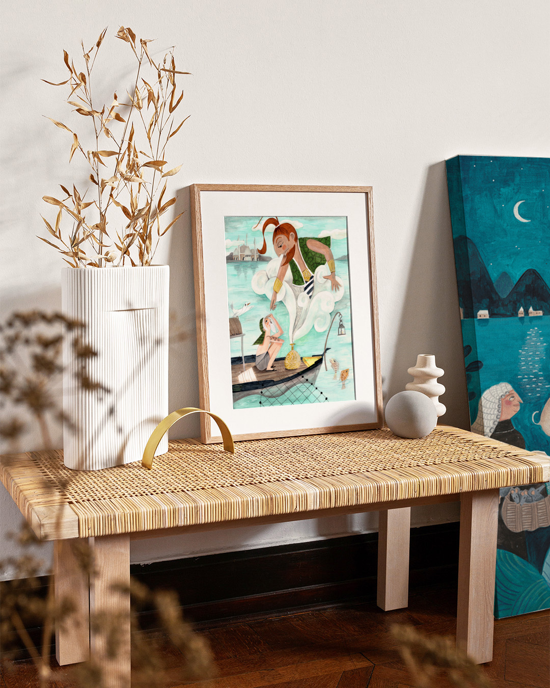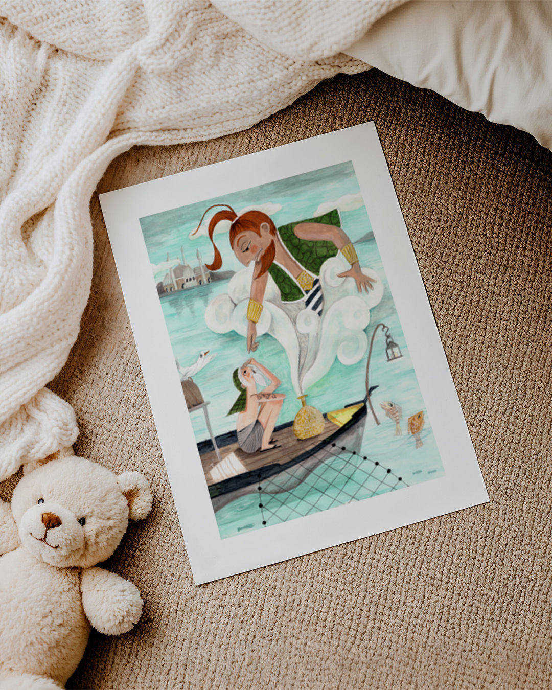 I denna fantasifulla illustration av Caroline Bonne Müller möter en fiskare en magisk ande i en flaska. Scenen med livliga färger och ett sinne för under berättar en förtrollande berättelse om fantasi och äventyr.