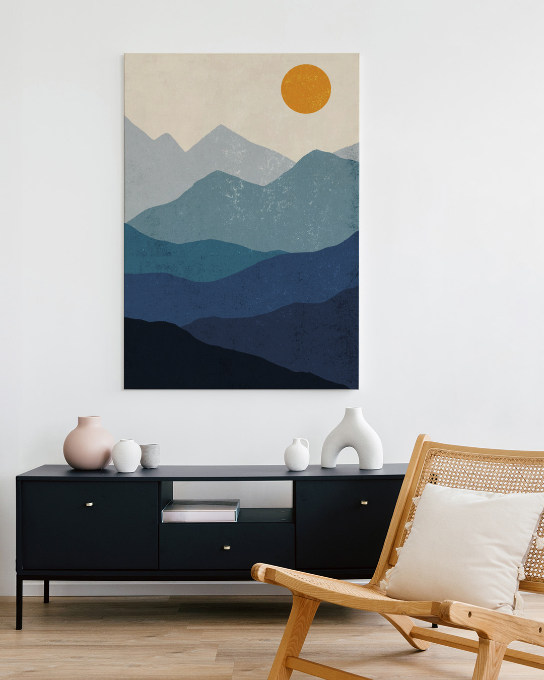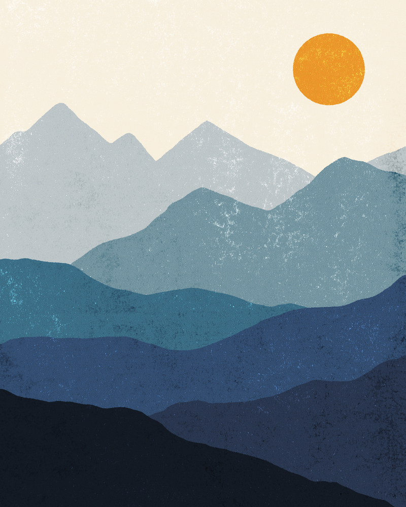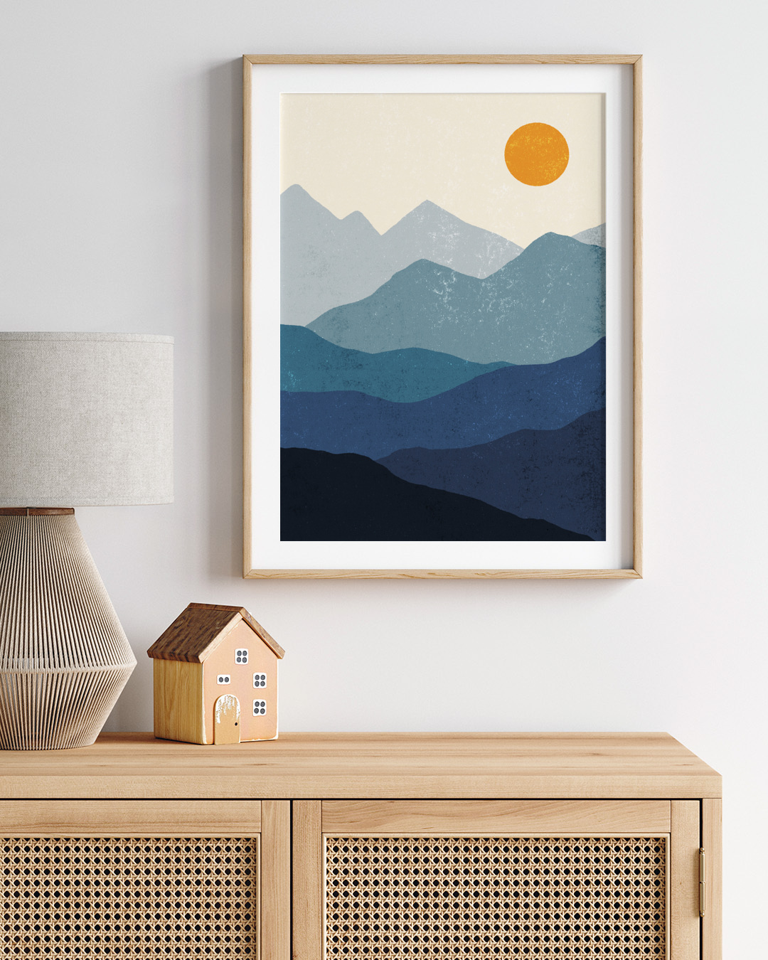 En rogivande grafisk tryck som visar en soluppgång över lager av berg, dominerad av beige och blå färger som ger en lugn och fridfull atmosfär.