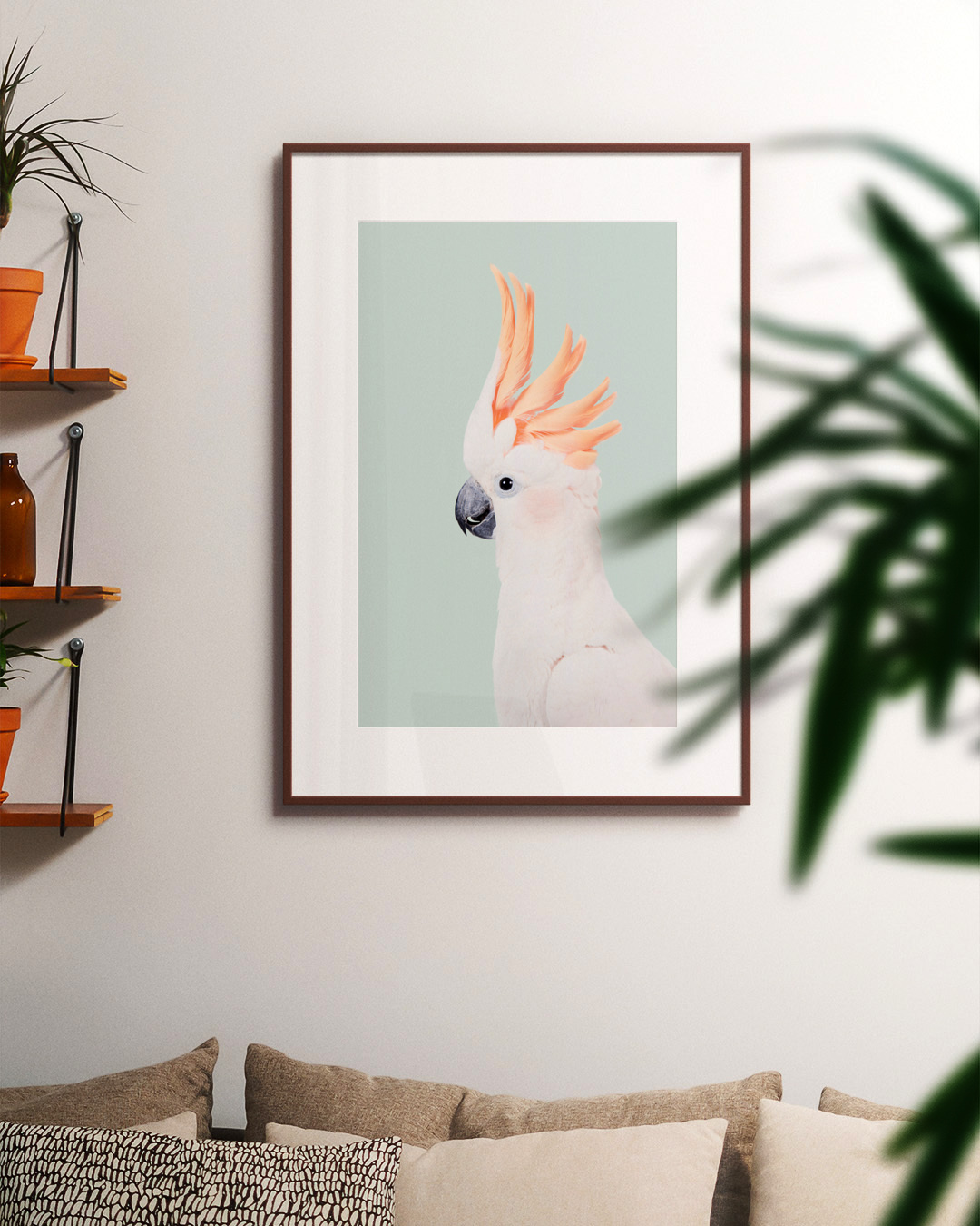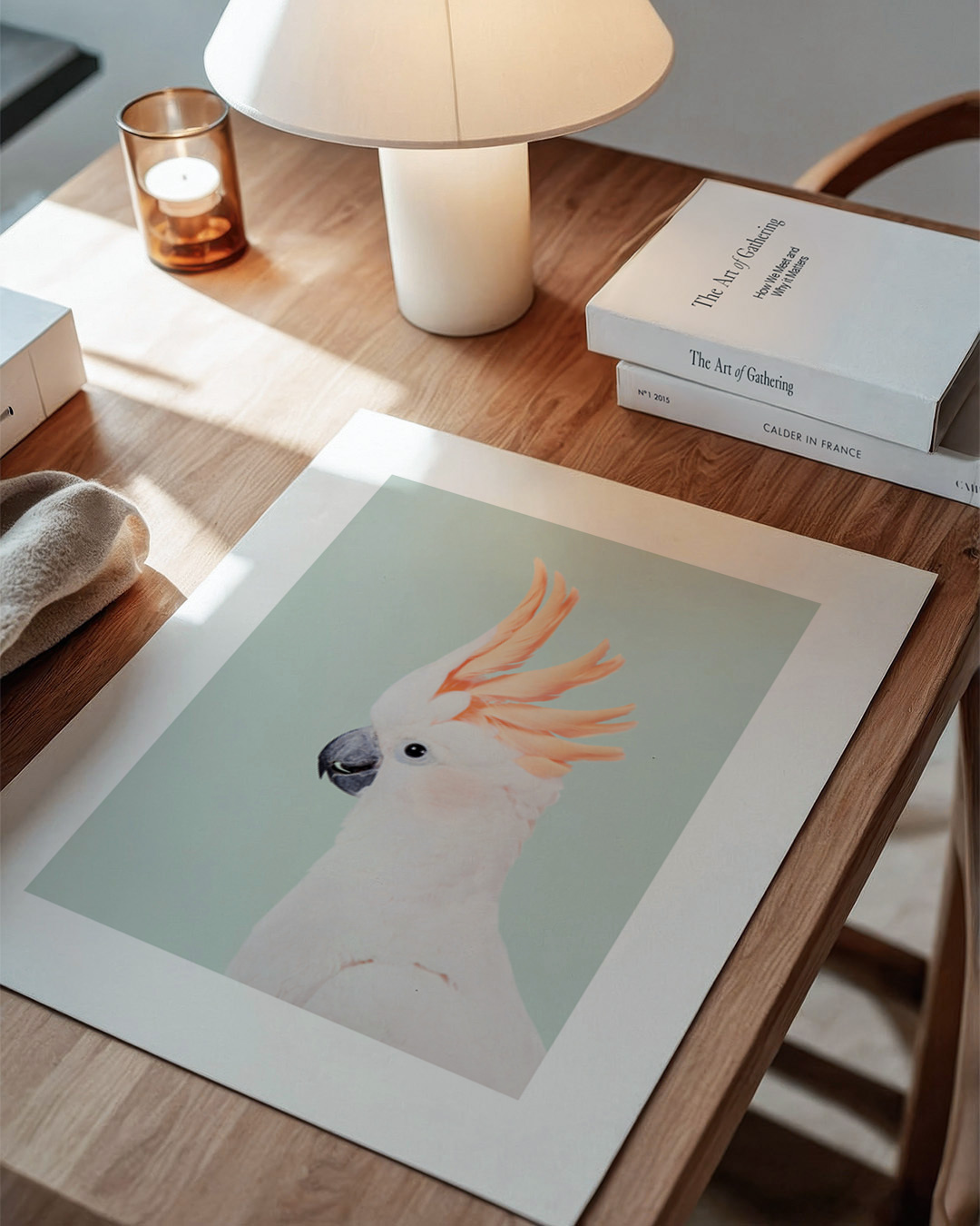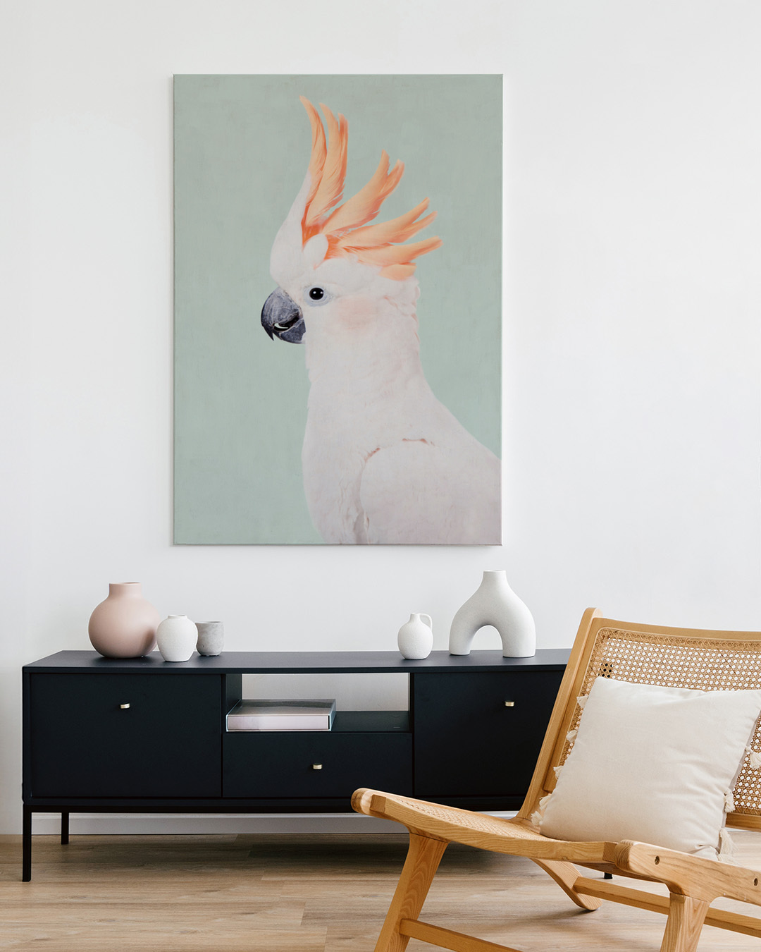 Regal och elegant, detta verk av Kathrin Pienaar föreställer en kakadua med en iögonfallande orange tofs mot en mjuk bakgrund, vilket ger en touch av sofistikering och vildmarkscharm till vilket rum som helst.
