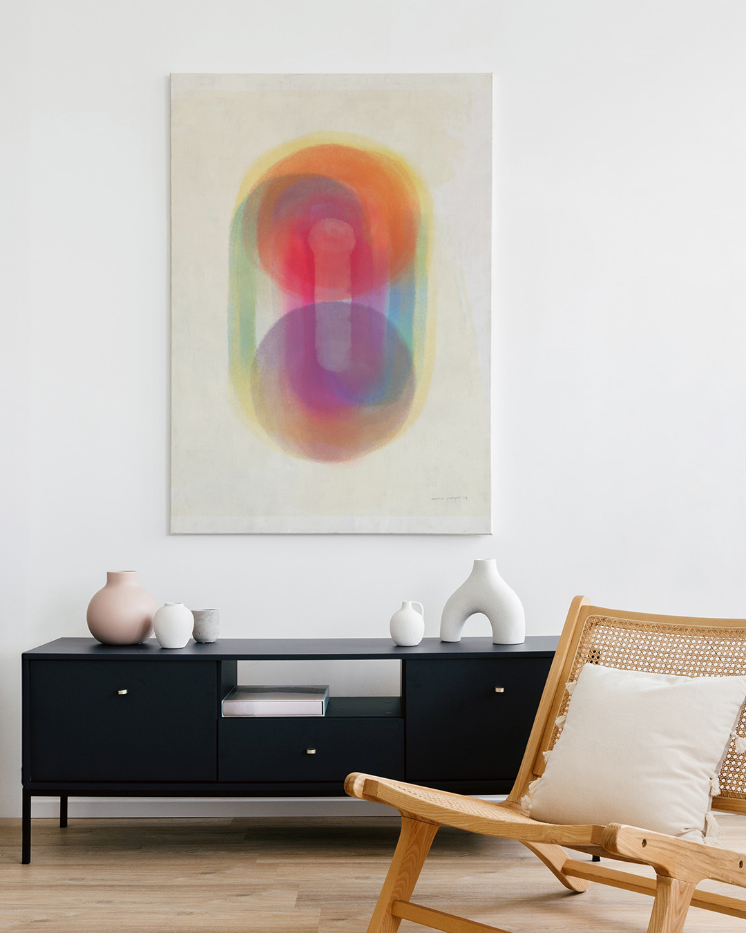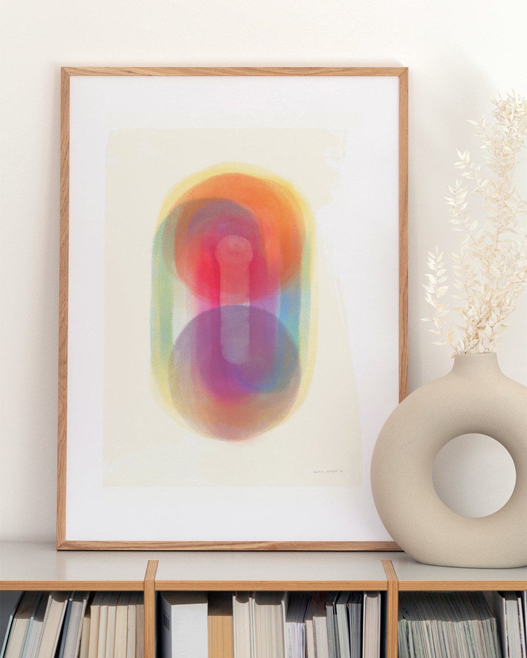 Den uppspända canvasen är inramad med en elegant skuggram i äkta trä för ett stilrent utseende och extra dimension. Utrymmet mellan canvasen och ramen skapar en svävande effekt.