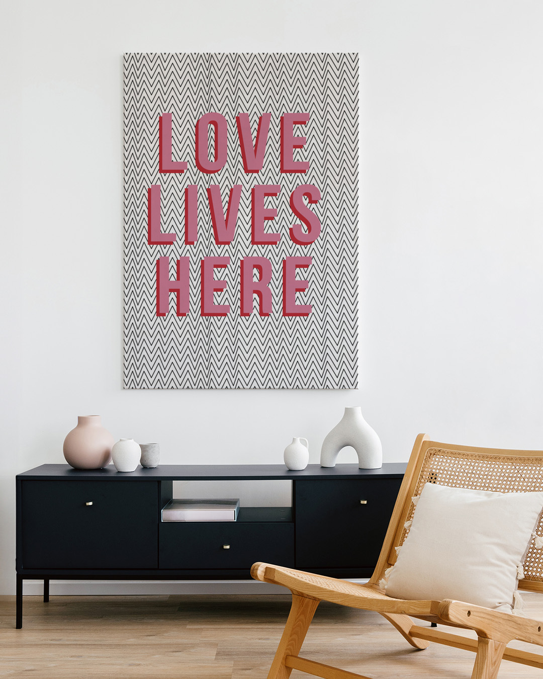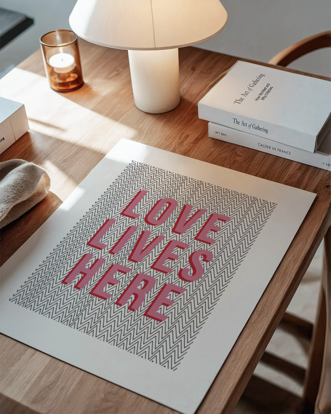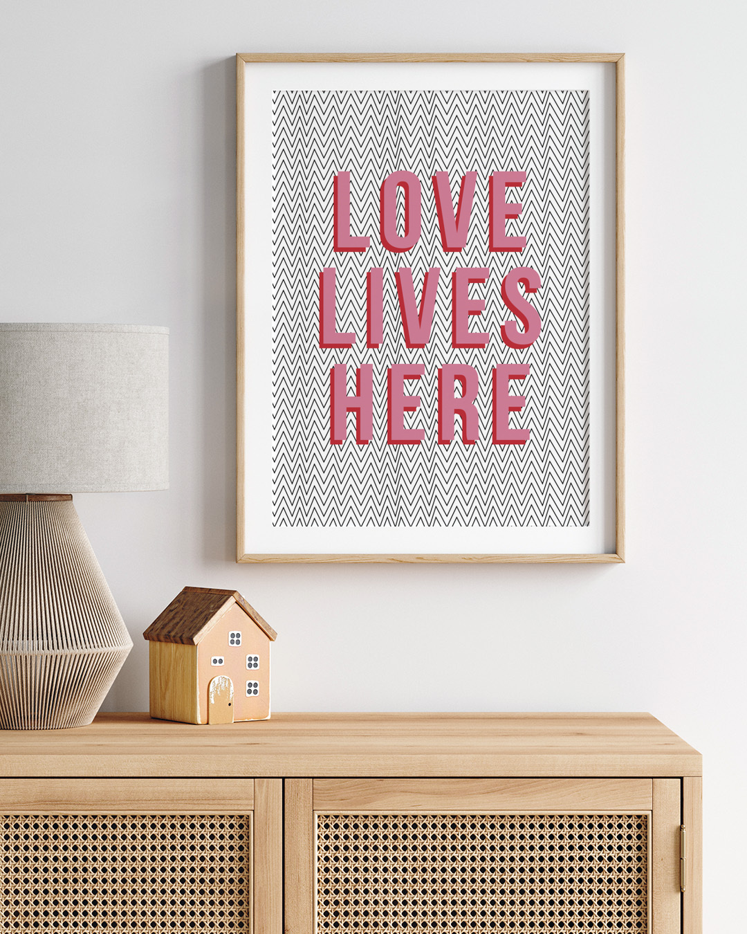 Denna lekfulla och hjärtevärmande konsttryck har det glada meddelandet 'Love lives here' mot ett dynamiskt sicksackmönster. Perfekt för att lägga till en humoristisk och charmig touch till vilket rum som helst.
