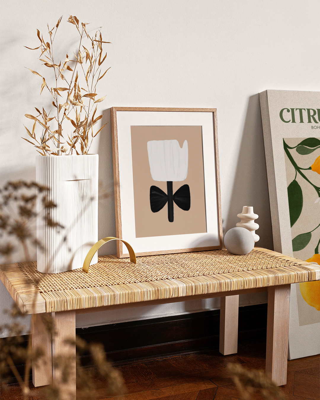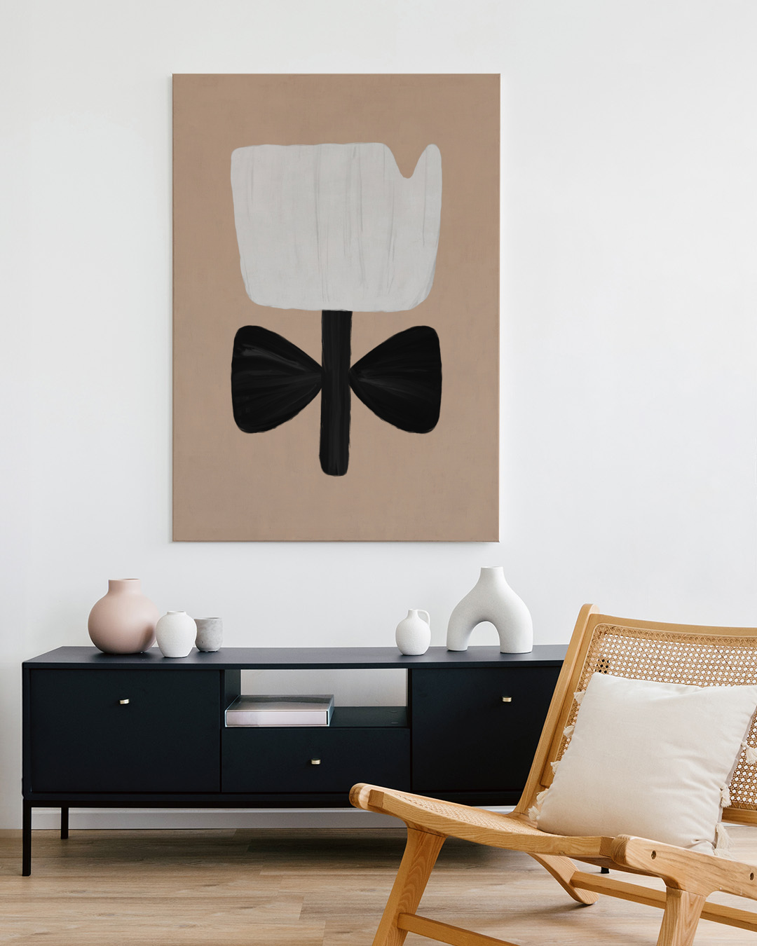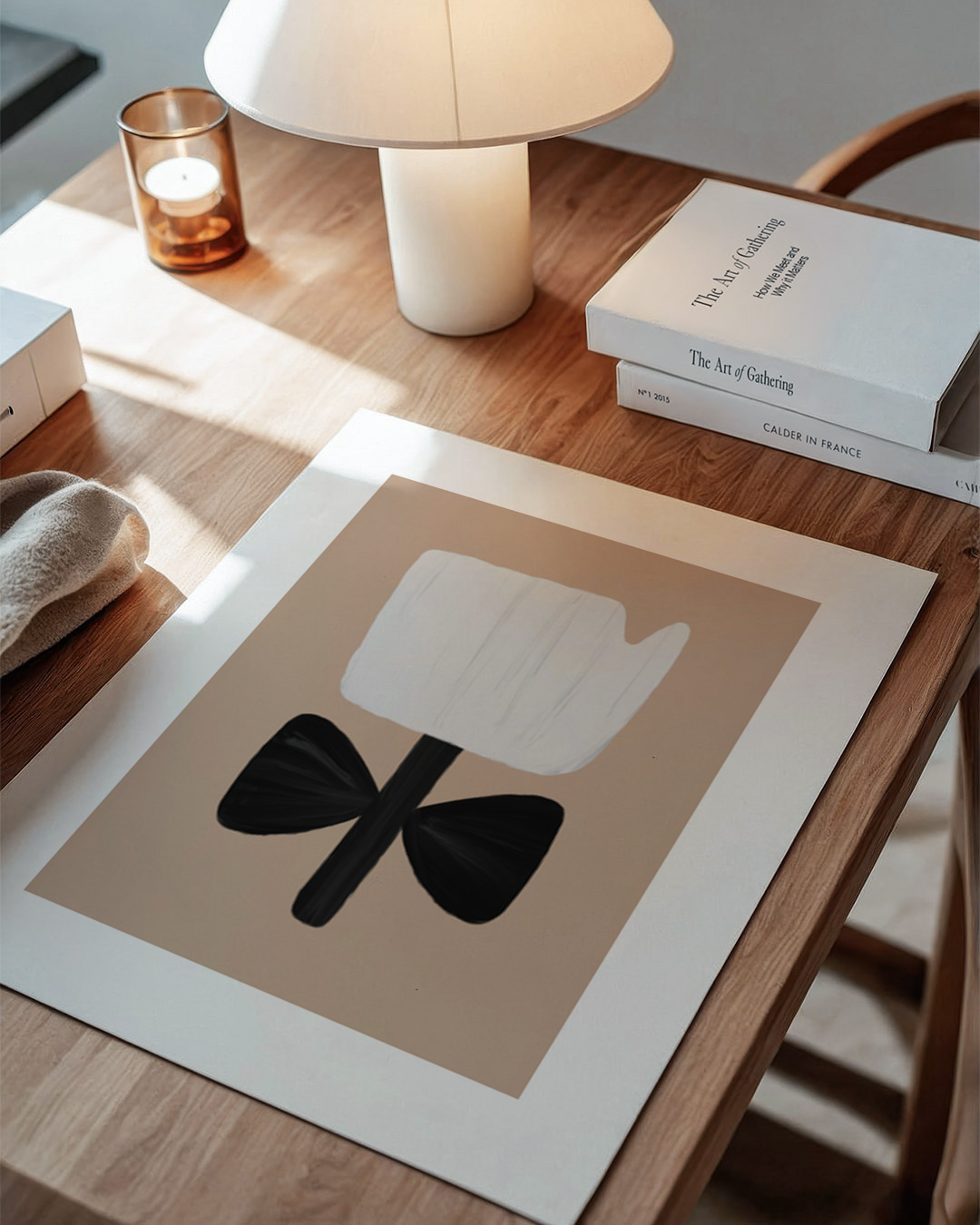 En minimalistisk illustration som visar en enkel blomform med beige och svarta nyanser. Den eleganta kompositionen och subtila färganvändningen ger en lugn och modern estetik, perfekt för att förbättra vilket interiör som helst.