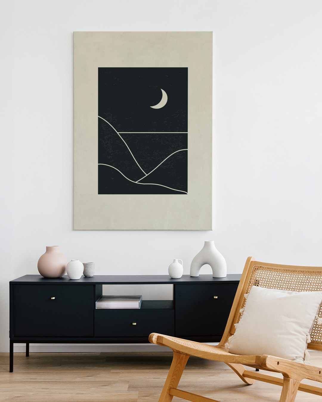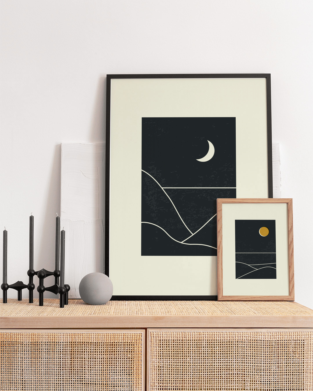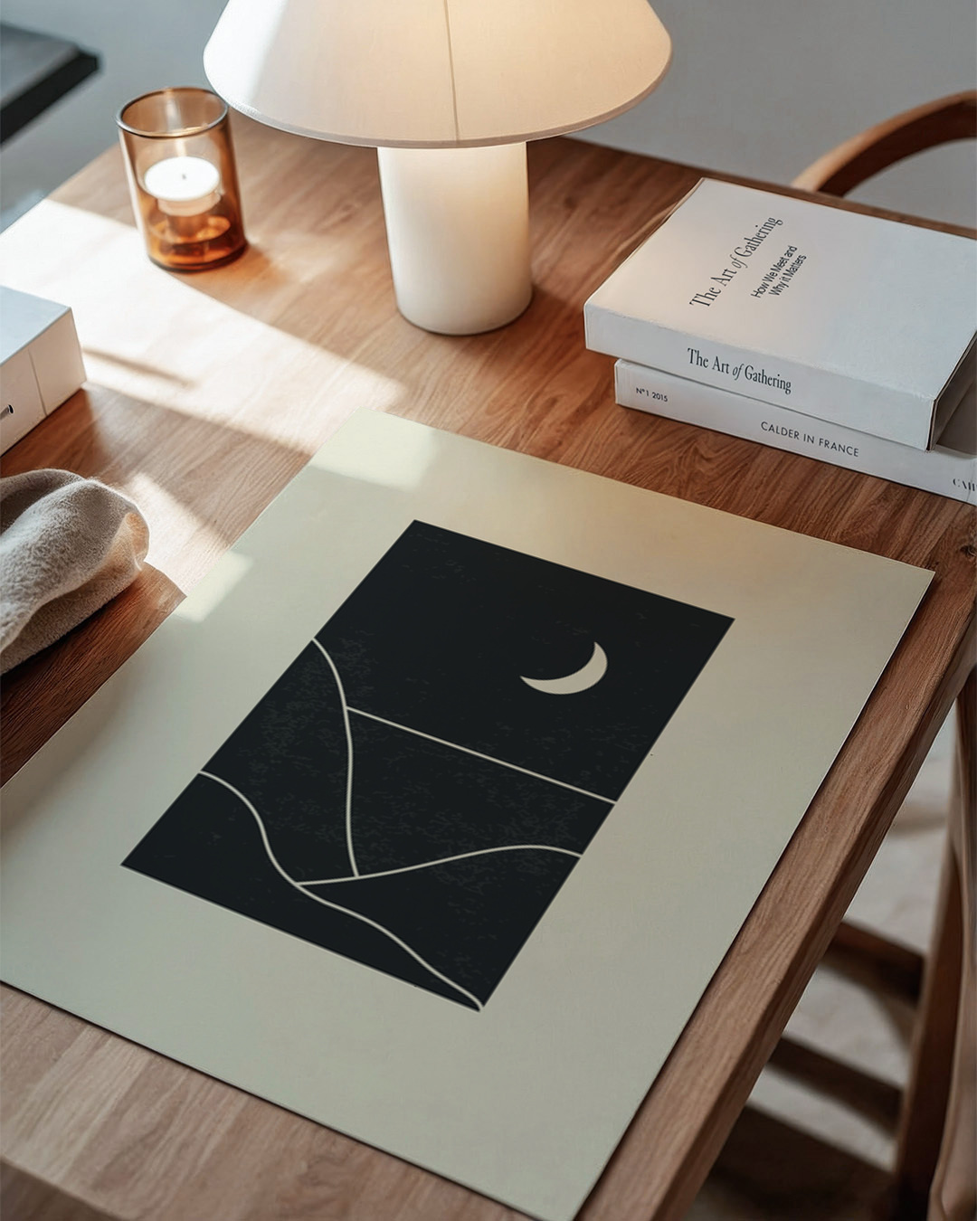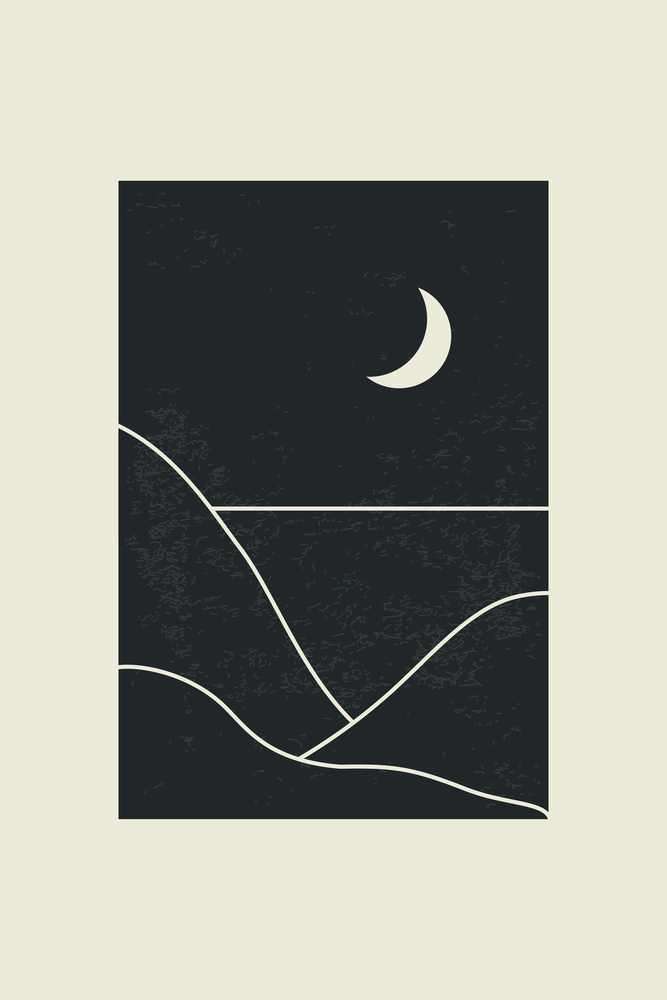 Denna stiliserade bild visar enkla bergslinjer under en månskära, perfekt för dem som uppskattar minimalistisk inredning och lugna landskap.