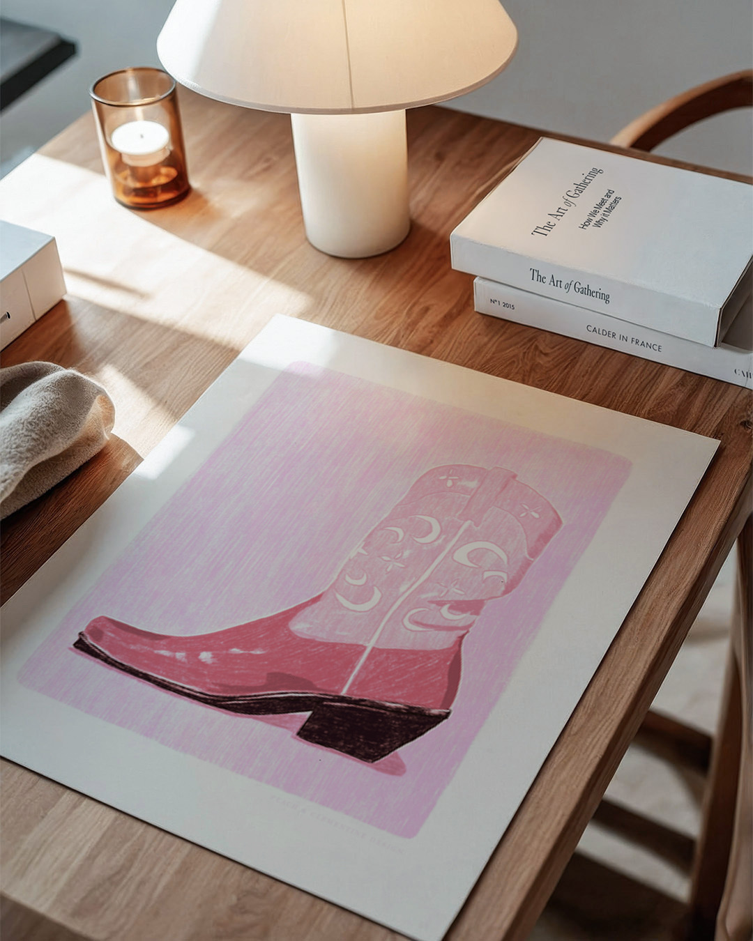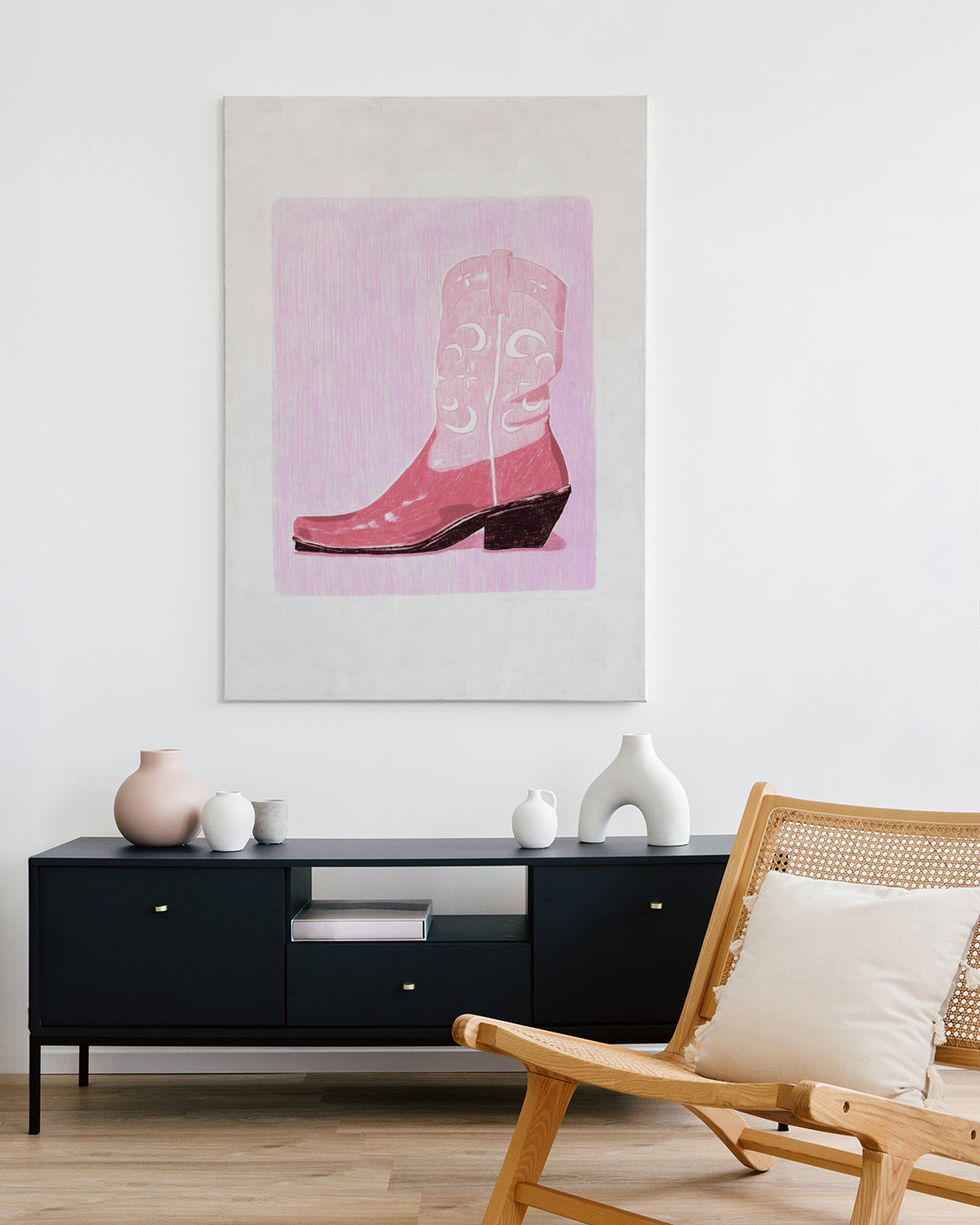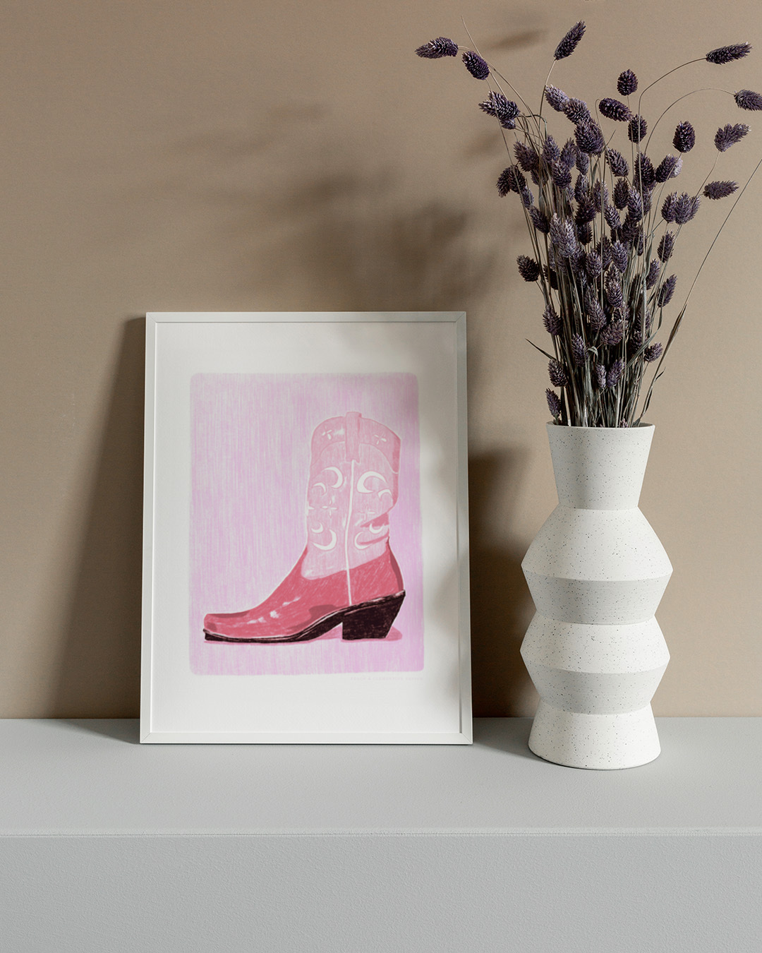 Denna konsttryck har en slående cowgirlstövel i rosa med intrikata mönster. Den djärva kontrasten mot den bleka bakgrunden skapar en modig och charmig design, perfekt för att lägga till lite västerländskt känsla.