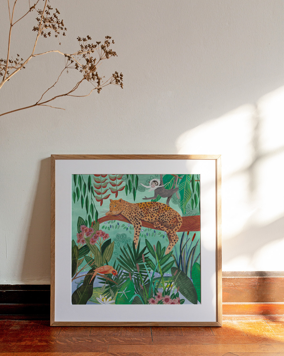 Caroline Bonne Müllers konstnärliga skildring av en lugn djungelscen visar en leopard som sover fridfullt på en gren, omgiven av frodig grönska, lekfulla apor och färgglada fåglar.