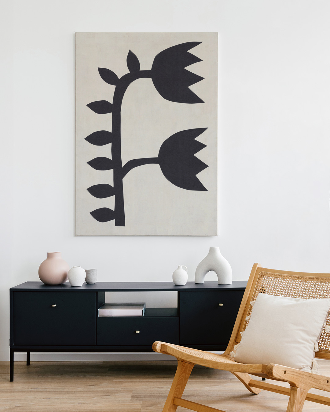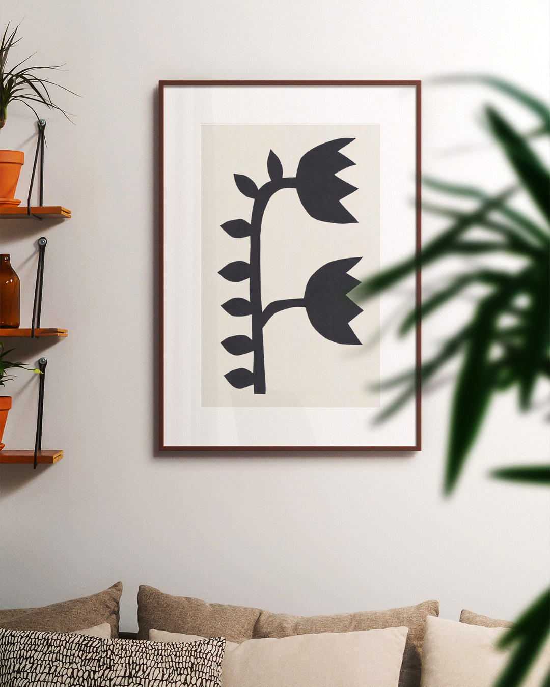 En fängslande grafisk affisch med stiliserade svarta tulpaner mot en beige bakgrund. Perfekt för älskare av botaniska och minimalistiska designer.