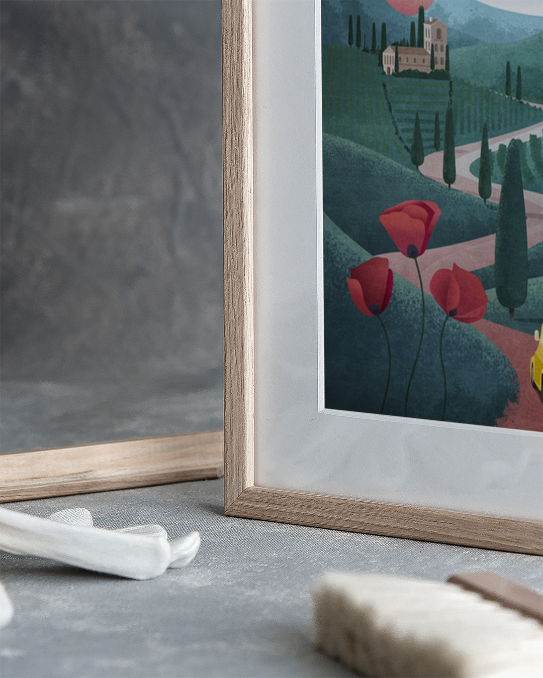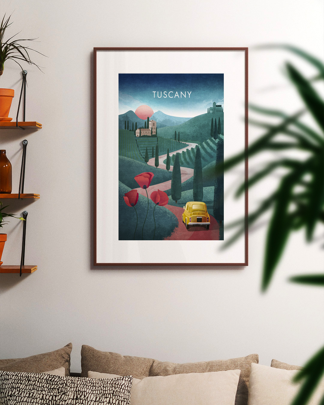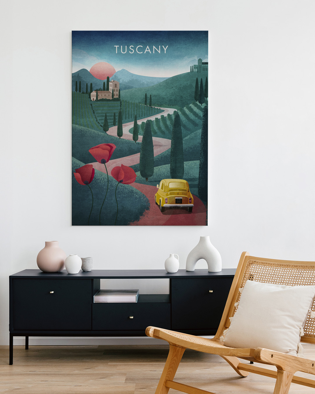 Emel Tunaboylu fångar den natursköna skönheten i Toscana med en levande illustration. Böljande kullar, vallmoblommor och en klassisk gul bil framkallar charmen från den pittoreska italienska landsbygden.